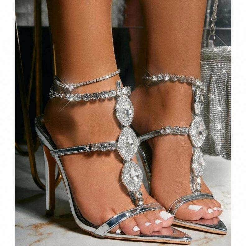 Nuevas Sandalias de Tacón Fino con Pedrería Dorada y Gemas para Mujer, Estilo Industrial, Punta Abierta, Verano 2026
