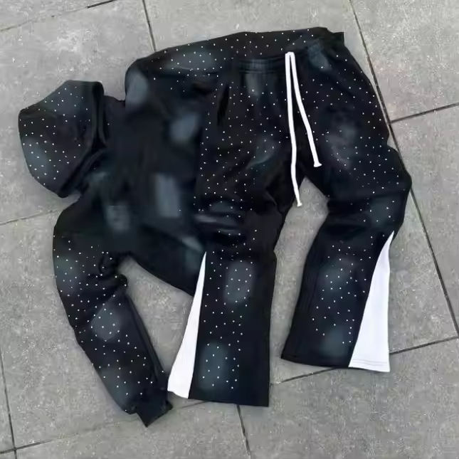 Conjunto de Sudadera con Capucha y Pantalones de Chándal de Forro Polar Acampanados, Estilo Vintage, Lavado y Desgastado con Efecto Sol, con Pedrería, Alta Calidad, Personalizado, Venta al por Mayor 2026