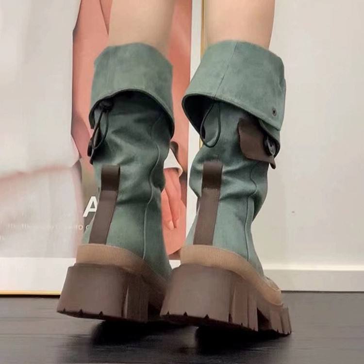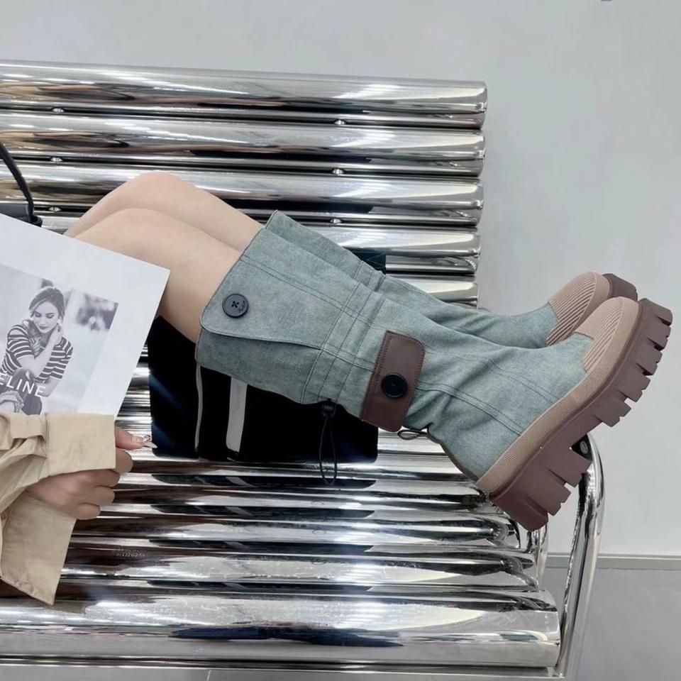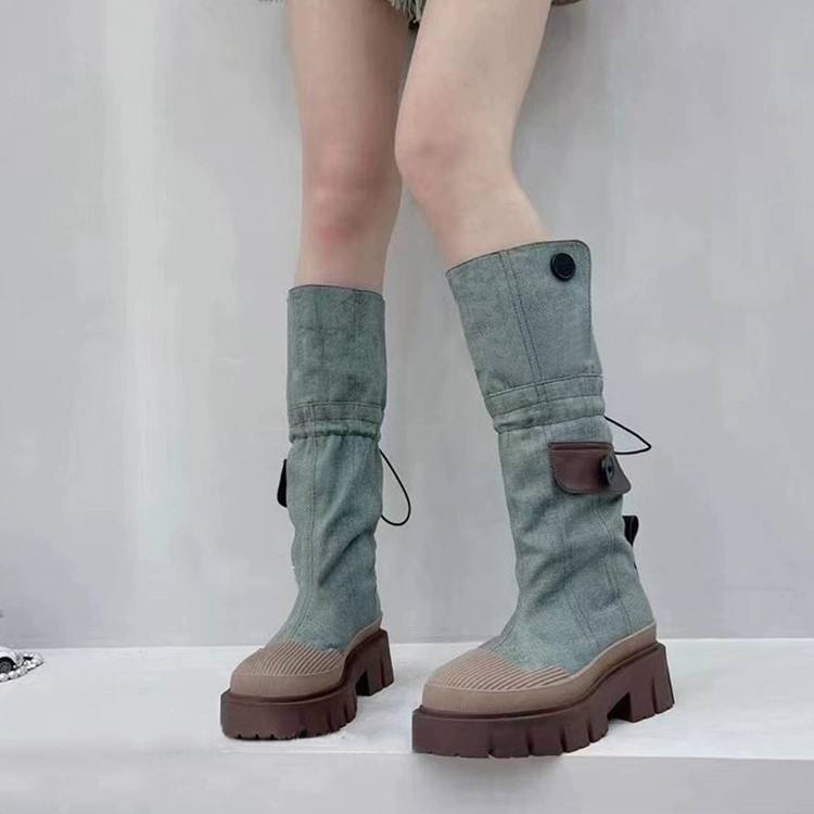Botas de montar largas para mujer 2026, de cuero genuino y mezcla de mezclilla lavada, con plataforma y suela gruesa, de caña alta, estilo caballero, efecto adelgazante