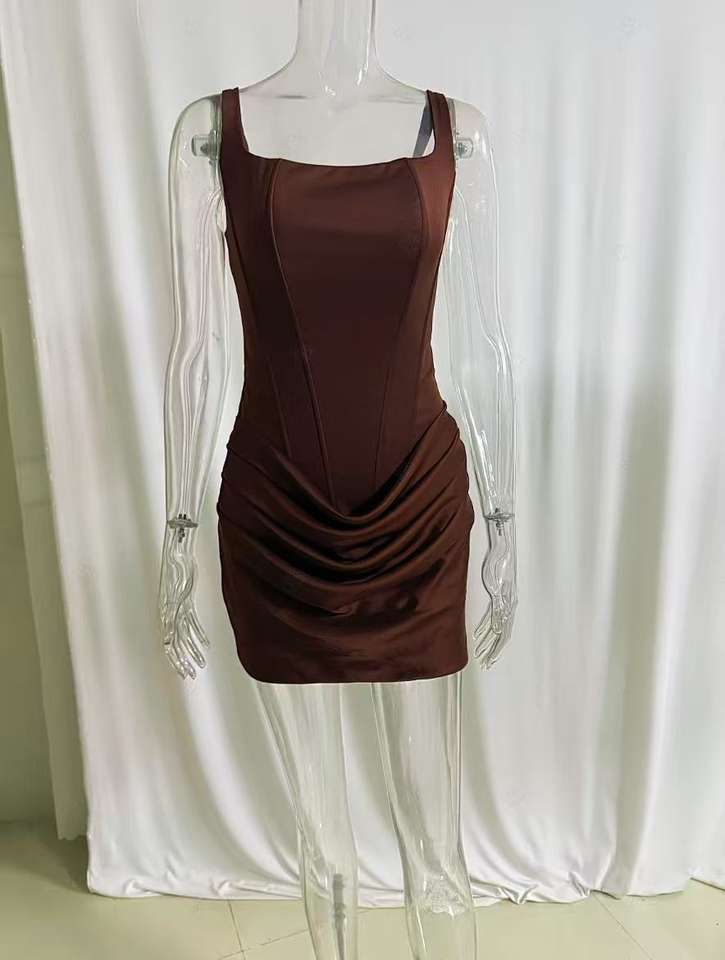 Vestido Mini Marrón Chic Fruncido para Mujer 2026, Cuello Cuadrado, Sin Mangas, Ajustado, con Dobladillo Plisado, Estilo Túnica, para Verano, Fiesta Urbana, Color Liso, Vestidos de Señora