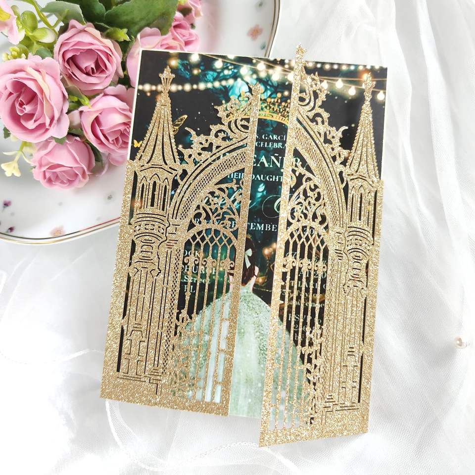 Juego de invitaciones de boda cortadas con láser, 20 tarjetas de invitación doradas brillantes con papel imprimible y sobres