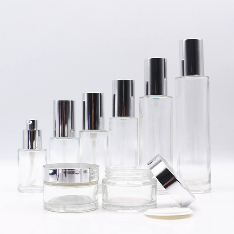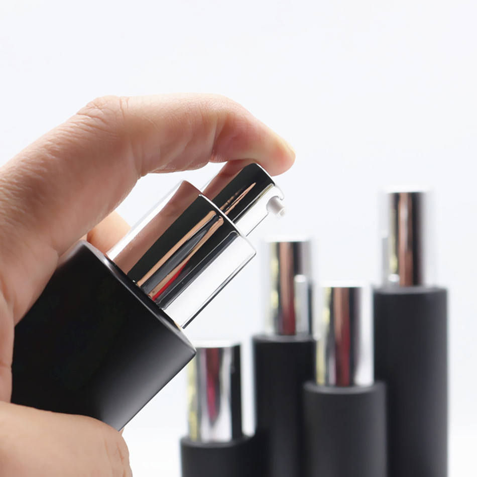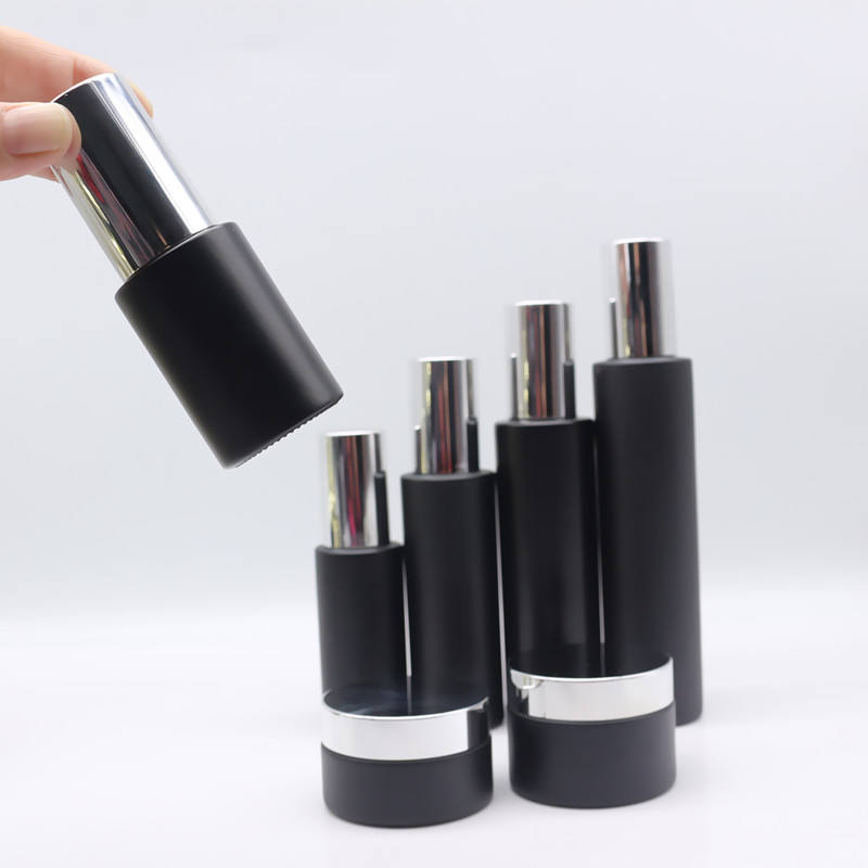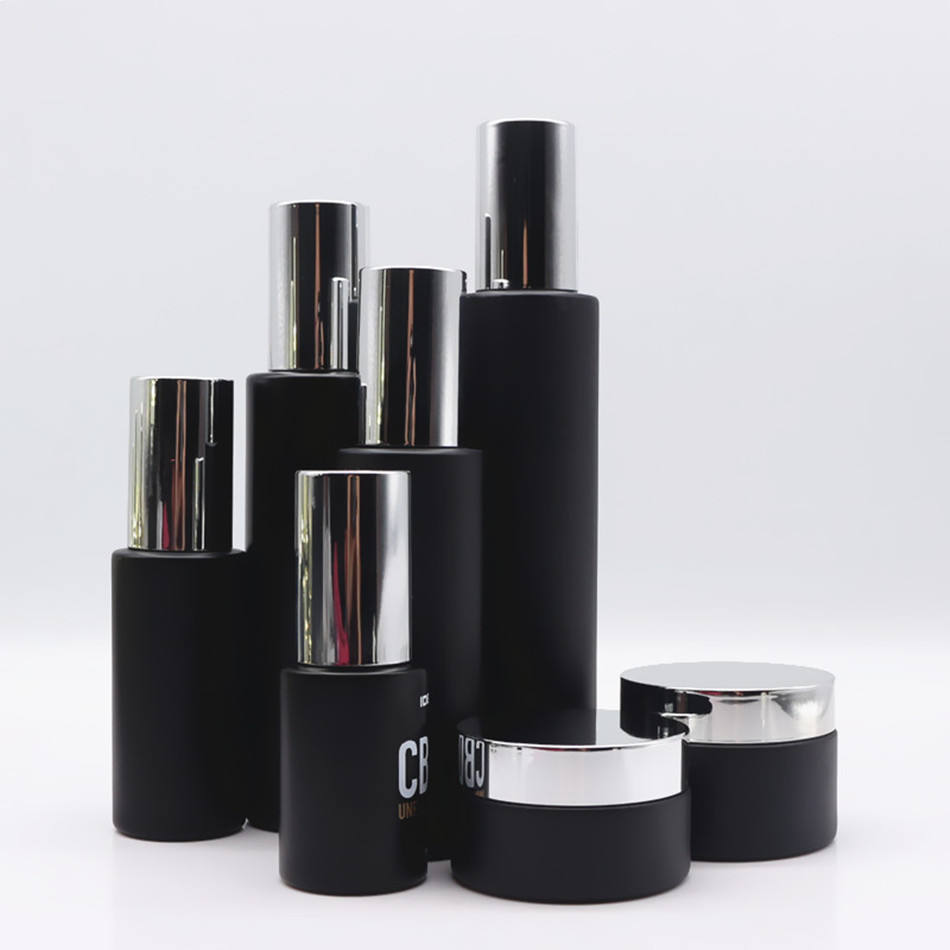 20ml 30ml 50ml 60ml 80ml 100mL 120ml Botella de vidrio de loción negra personalizada vacía con tapa de bomba de suero Juego de cosméticos 30g 50g Botes de crema
