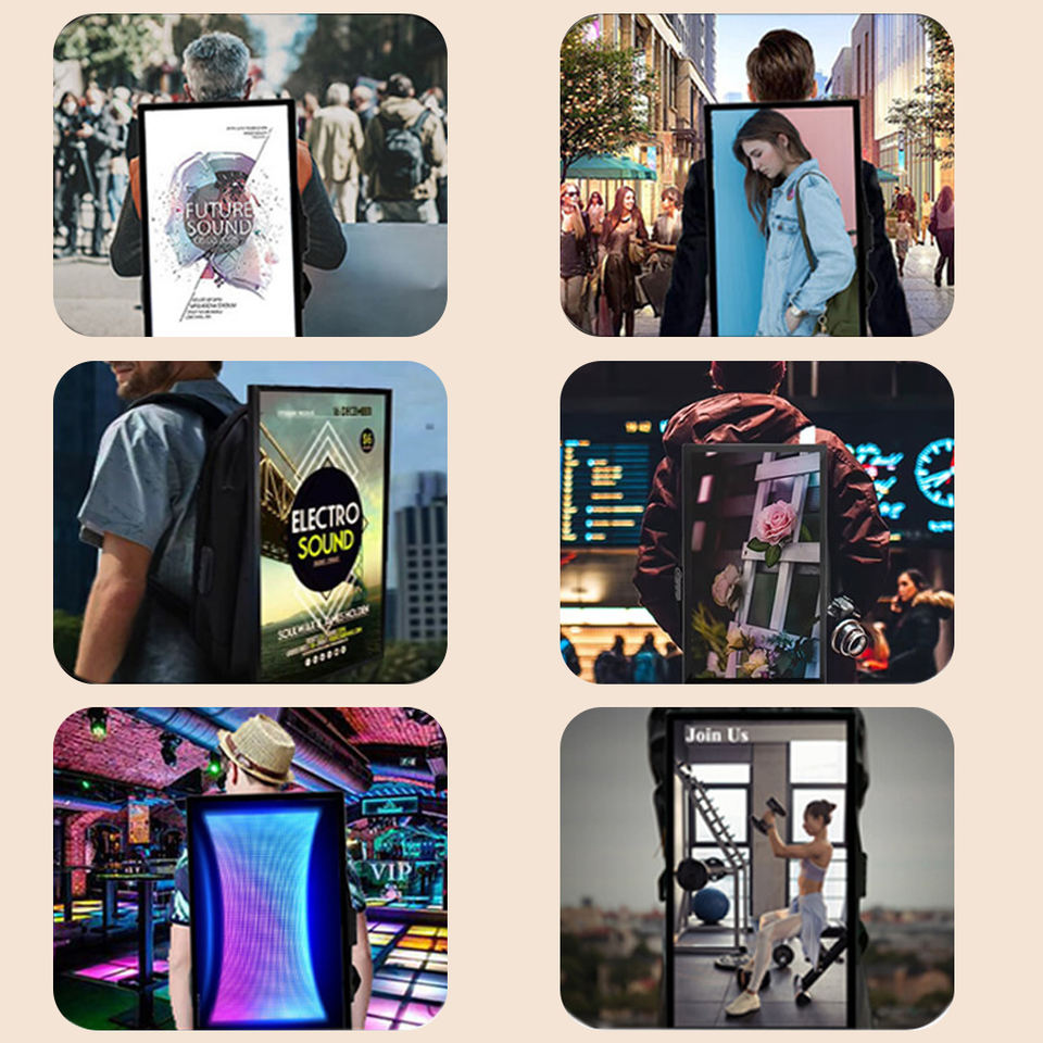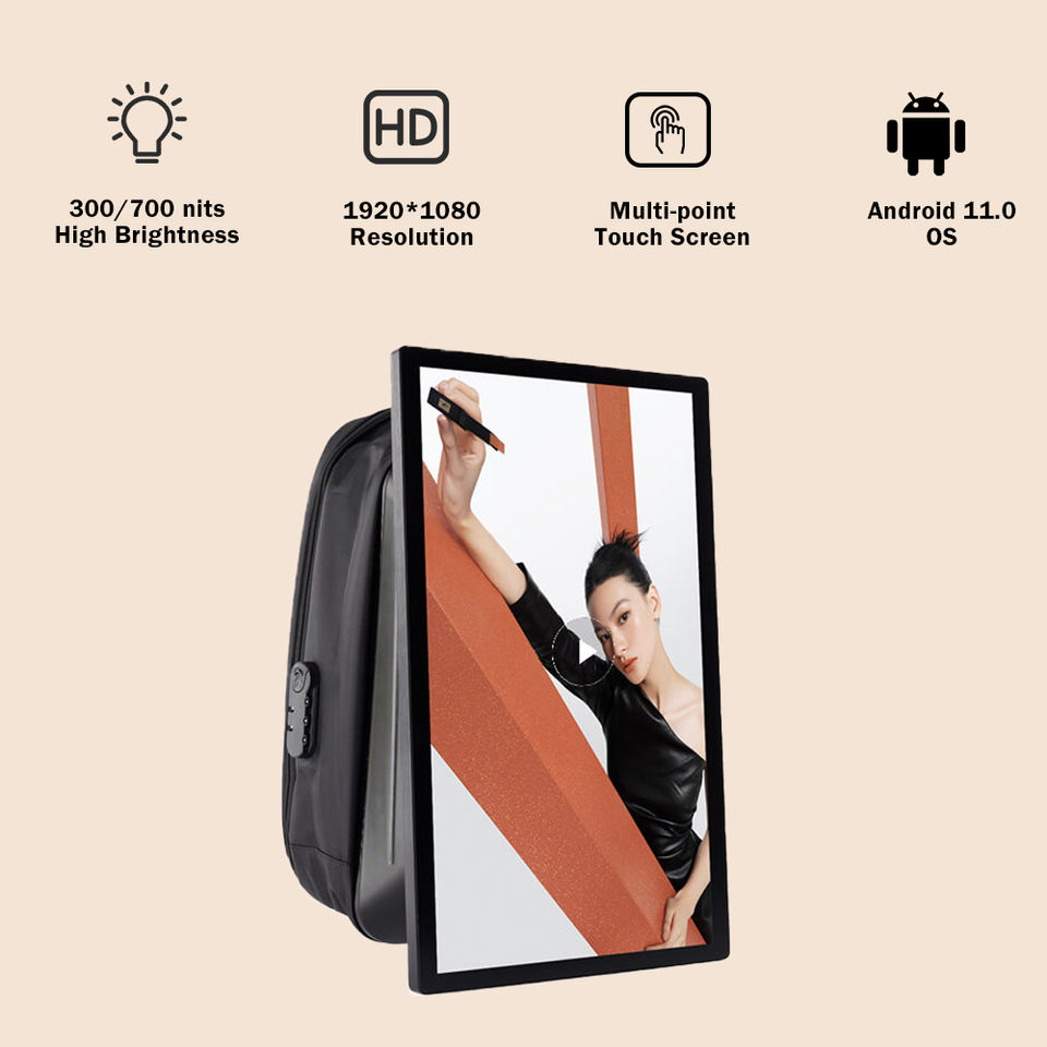 Pantalla LCD para Exteriores de 21.5 Pulgadas Full HD IP65, Señalización Digital, Pantalla Gráfica de Alto Brillo, Mochila Publicitaria con Persona Caminando