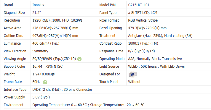 Innolux 21.5 Inch G215HCJ-L01 Industrial LCD Module 1920(RGB)*1080 FHD 102PPI 400nits Designed for Outdoor Industrial