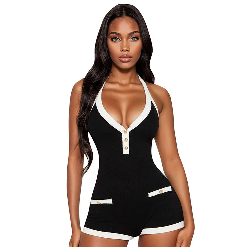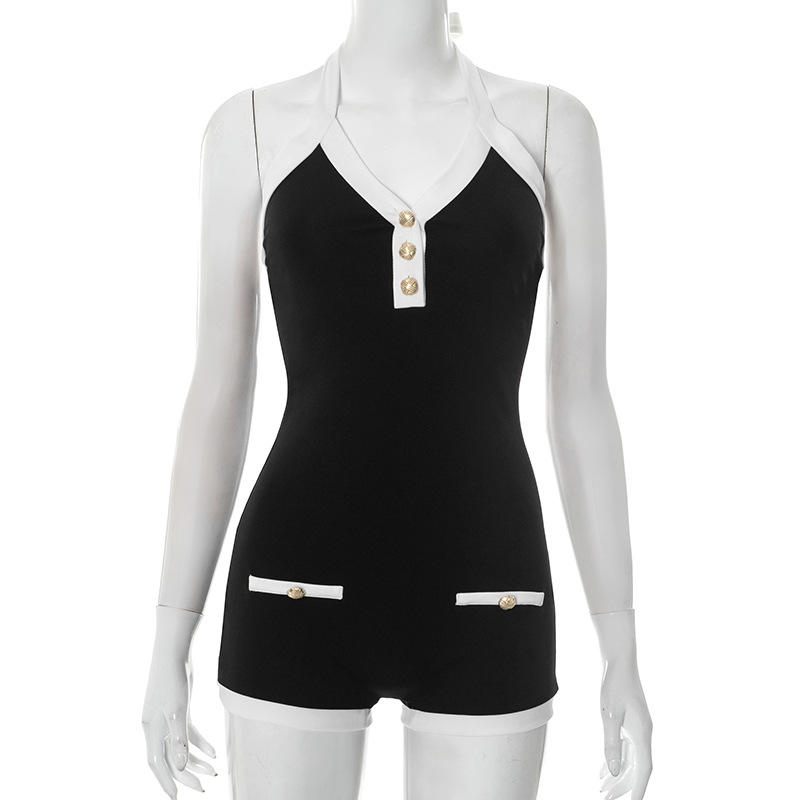 215 Mono de primavera y verano con cuello anudado, sin espalda, con botones y cintura fruncida