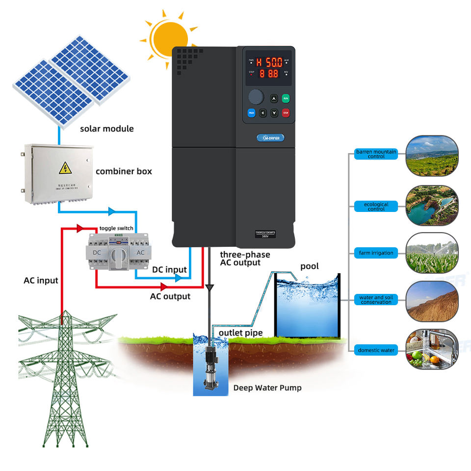 El sistema de bombeo solar consta de:Bomba de CA, paneles solares e inversor