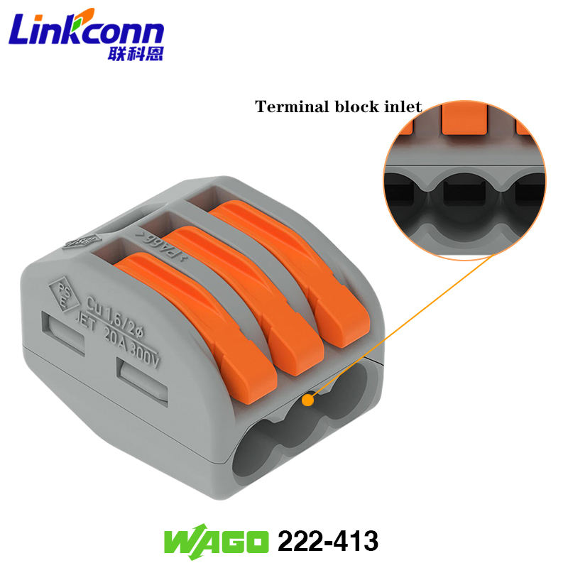 Conector de Cable de Empuje de 3 Polos de Alta Calidad 222-413 ENEC CE, Conector de Empalme con Palancas, Terminales WAGOS para Cableado de 2.5mm