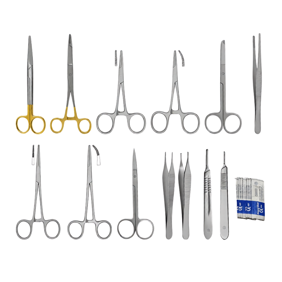 Juego de 23 Piezas de Instrumentos para Cirugía Menor, Kit Quirúrgico de Acero Inoxidable, Portaagujas TC, Tijeras, Pinzas, Bisturí, Reutilizable