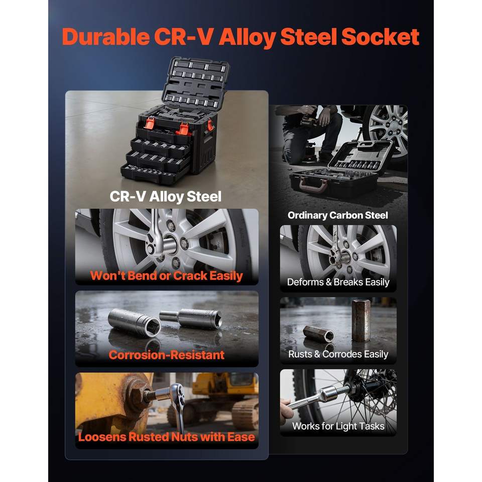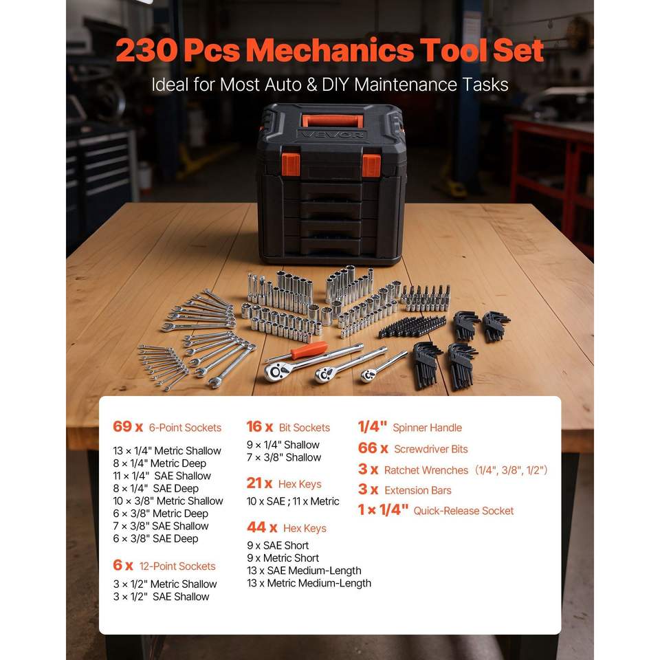 Juego de Herramientas de Reparación de Automóviles de 230 Piezas, Kit de Mecánica con Llaves de Tubo SAE y Métricas de 1/4'', 3/8'' y 1/2'', Destornilladores para Reparación de Automóviles