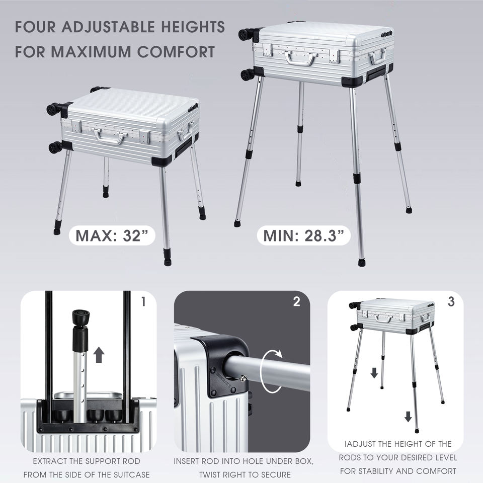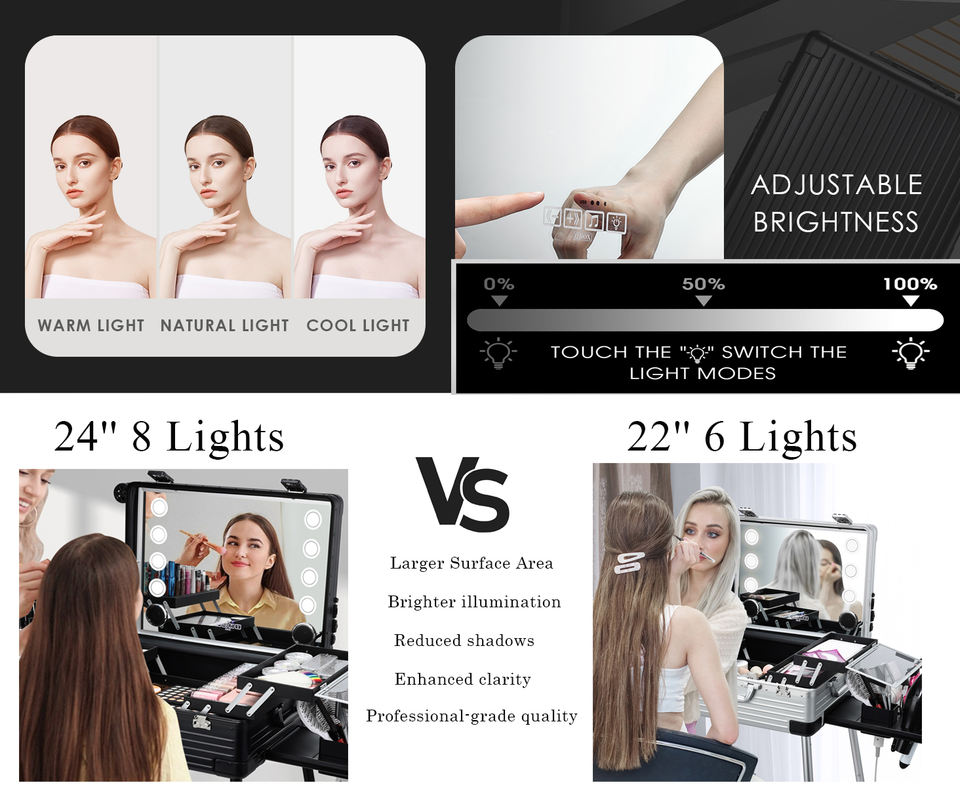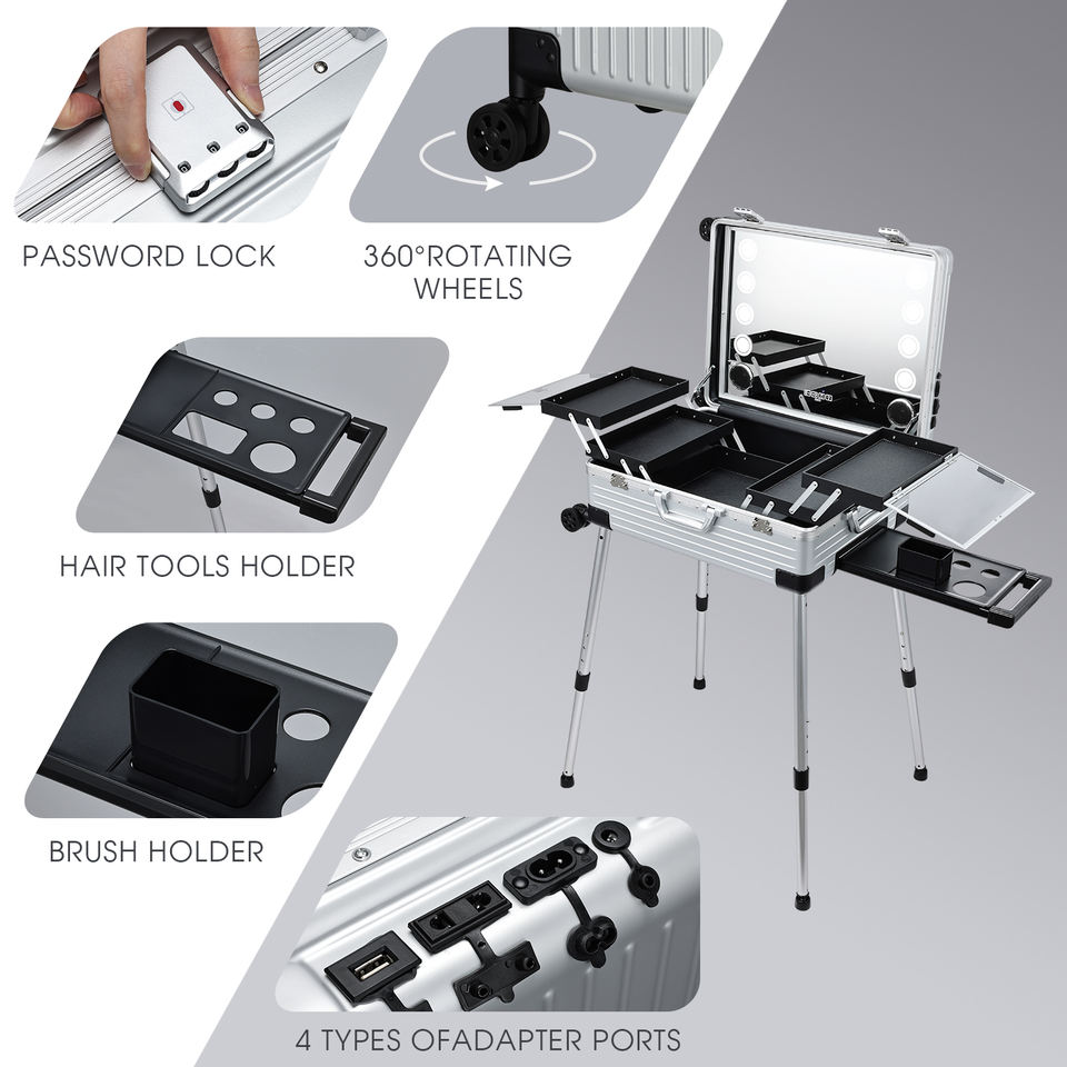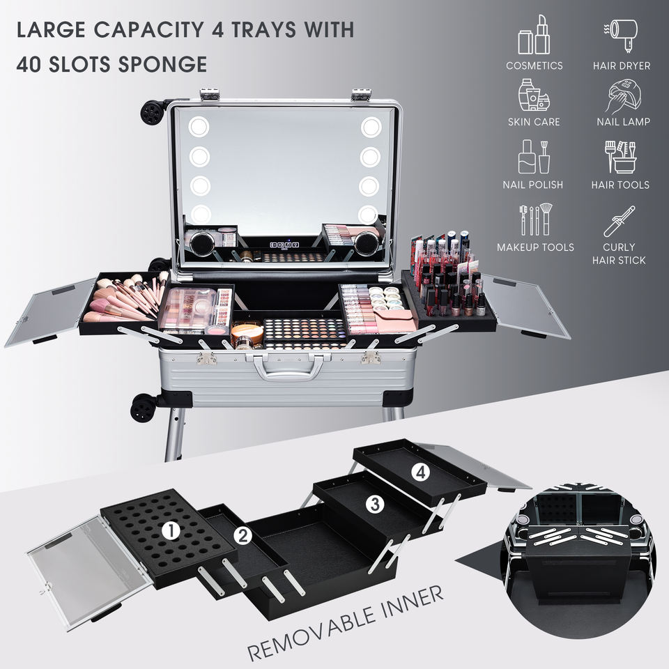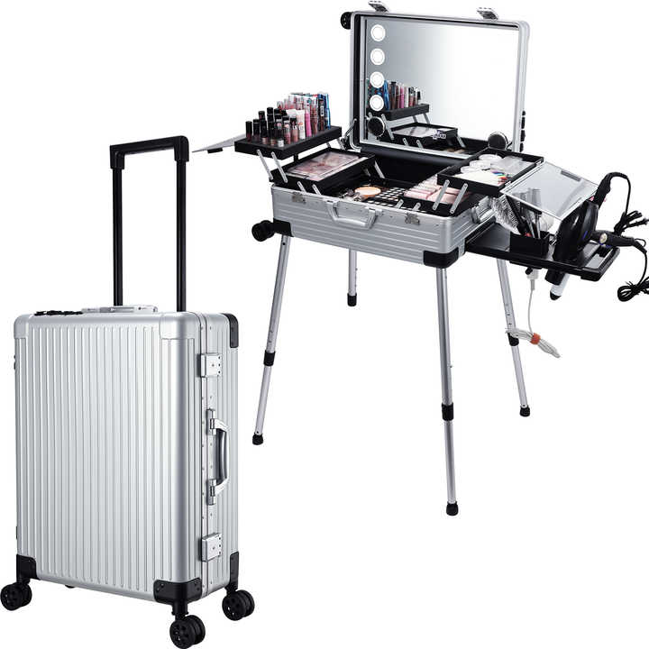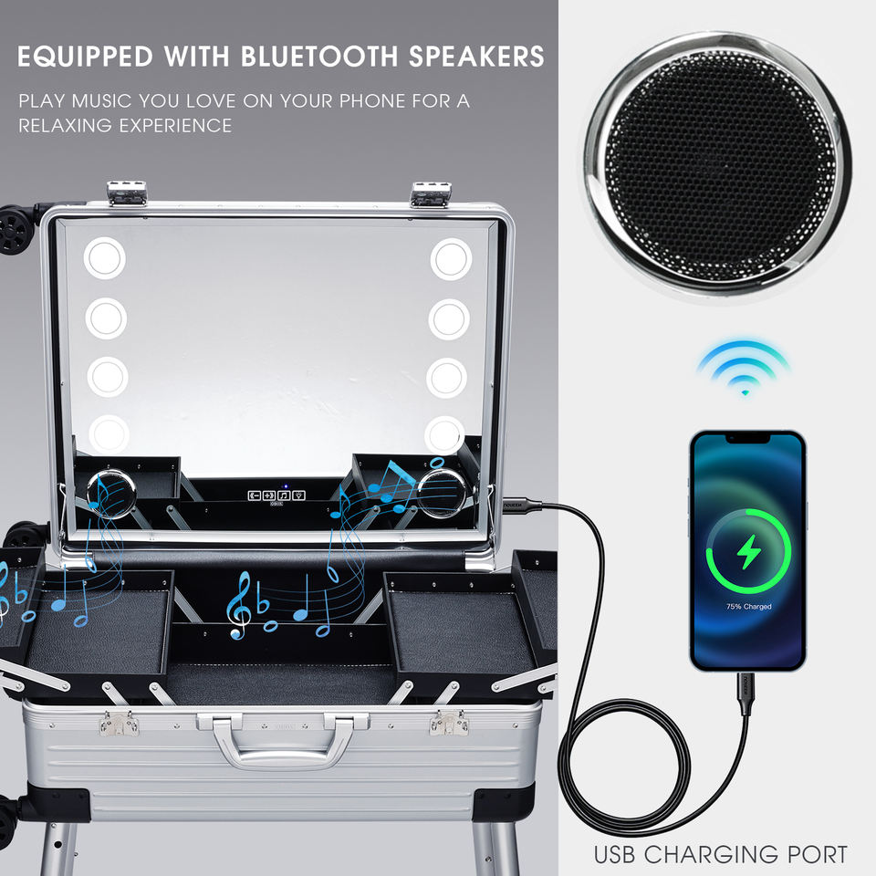 Maletín de maquillaje de pantalla completa 24'' con espejo iluminado, altavoz Bluetooth, trolley rodante de aluminio para barbería y salón de peluquería