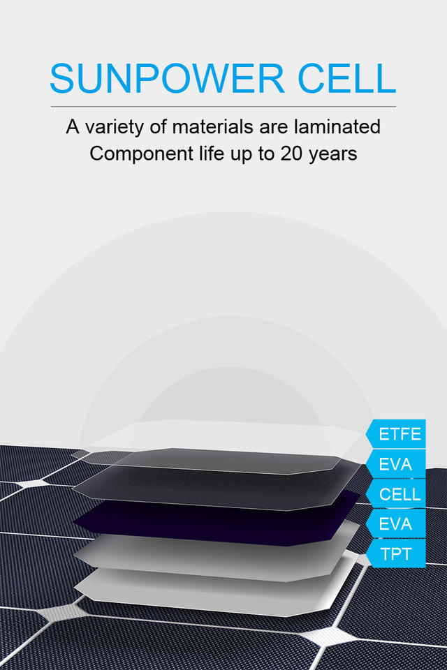 Panel Solar Semiflexible Sunpower Pet Etfe de 200w y 24% de Alta Eficiencia para Yates, Autocaravanas y Embarcaciones