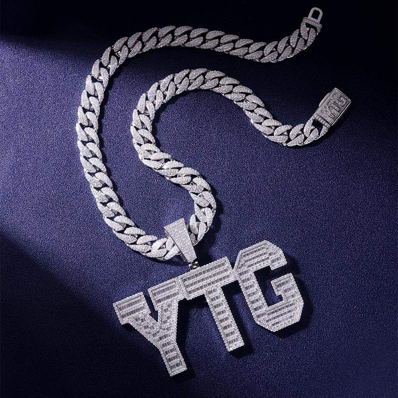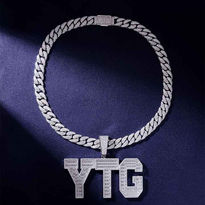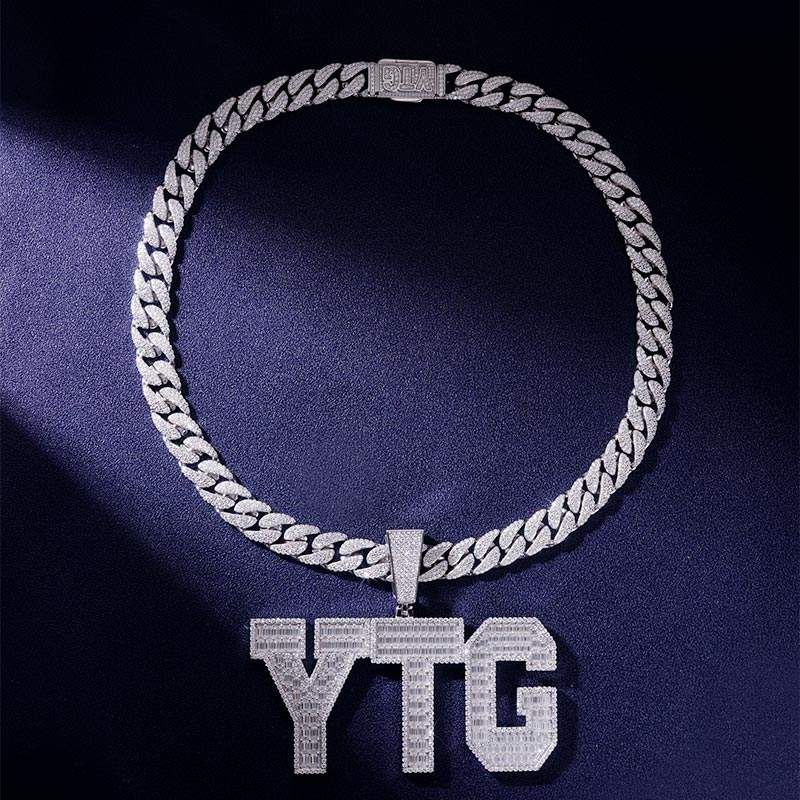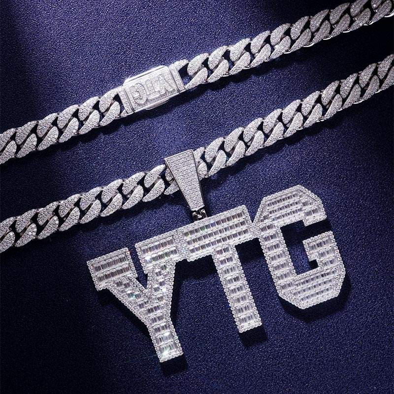 Cadena Cubana Miami de 24 Pulgadas y 12mm con Colgante de Letra, Oro Blanco Sólido de 14K, Diamantes de Laboratorio D VVS, Lujo