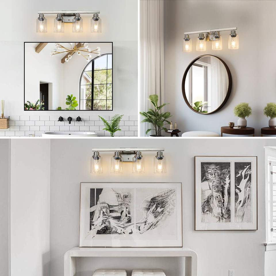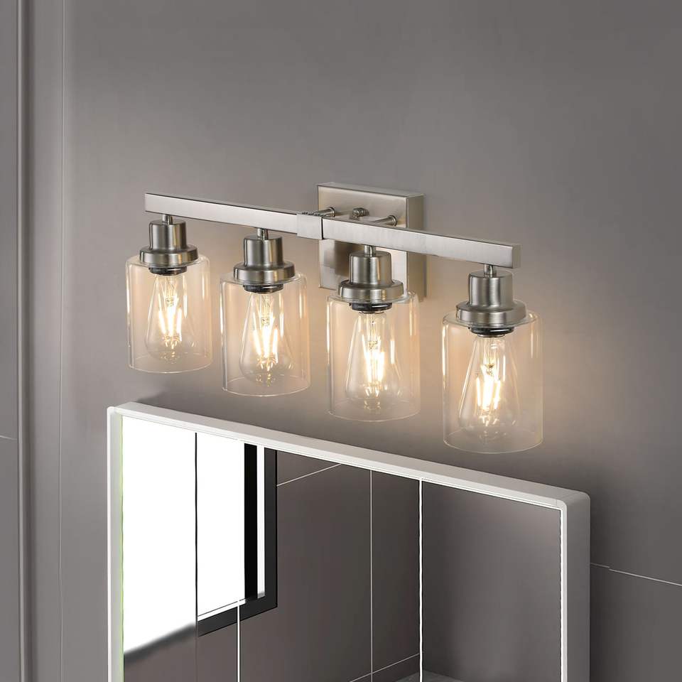 Lámpara de Baño Moderna de 24 Pulgadas con 4 Luces, Acabado en Níquel Cepillado con Pantallas de Vidrio Transparente para Muebles de Baño