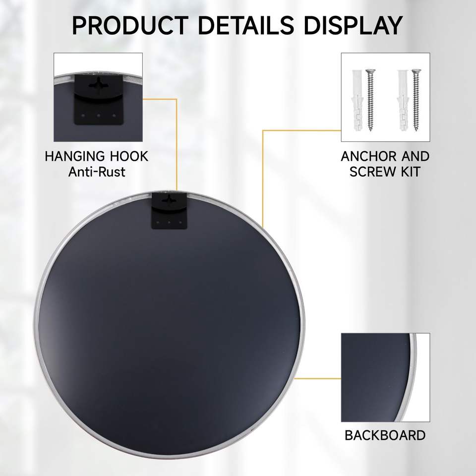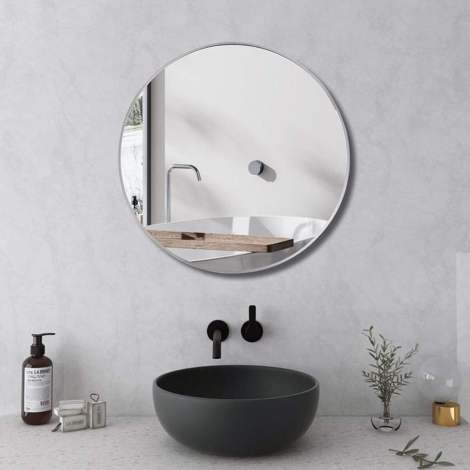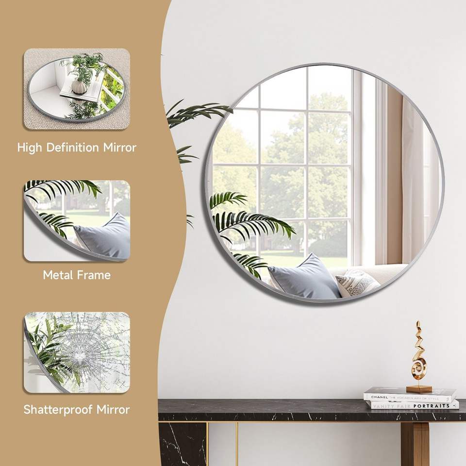 Espejo de Pared Circular Plateado de 24 Pulgadas con Marco Metálico, Espejo Redondo para Baño, Espejos Circulares, Espejo Plateado de 24 Pulgadas