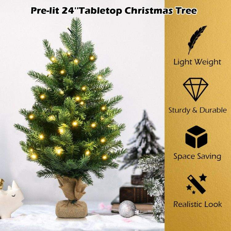 Árbol de Navidad Artificial de Abeto de 24 Pulgadas para Mesa con Luces LED, Elemento Decorativo Festivo Elegante y Duradero