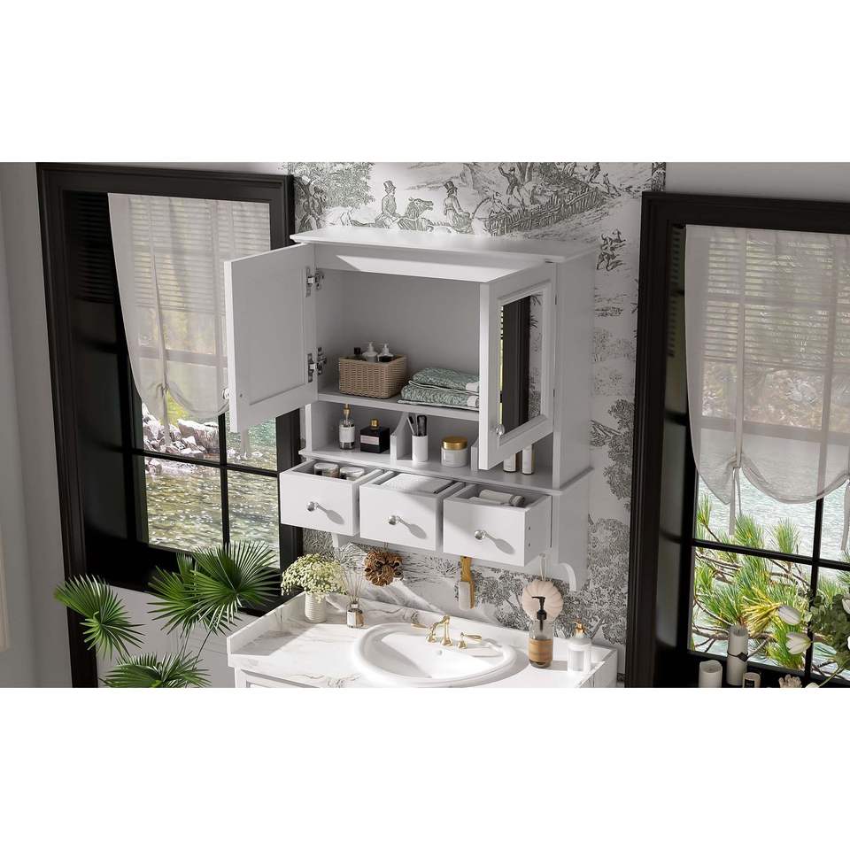 Gabinete de Baño con Espejo 4 en 1 de 24 Pulgadas para Montar en la Pared, Gabinete de Medicamentos de Alta Definición con Cajones Organizadores y Ganchos