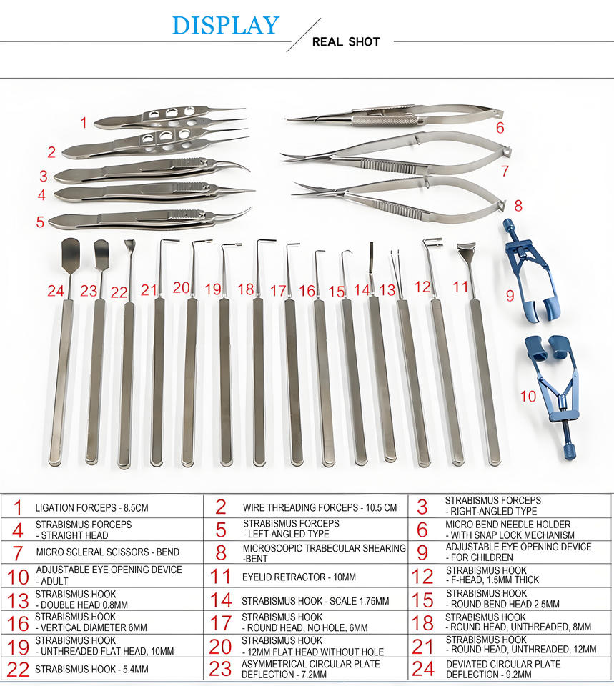Nombre del producto:Juego de 24 piezas de instrumentos quirúrgicos oftálmicos para estrabismo