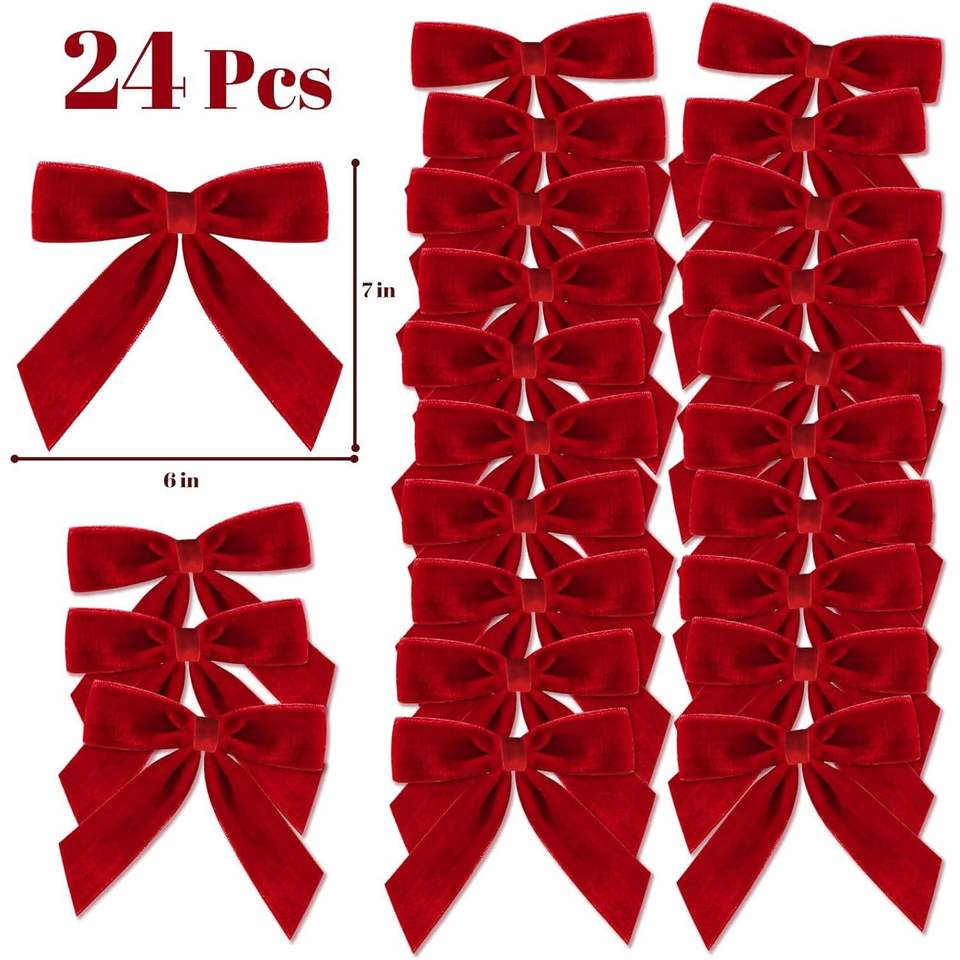 24 Lazos de Terciopelo Rojo Mediano de 7 x 6 Pulgadas, Lazos de Cinta Borgoña para Árbol de Navidad, Decoraciones Navideñas y Coronas