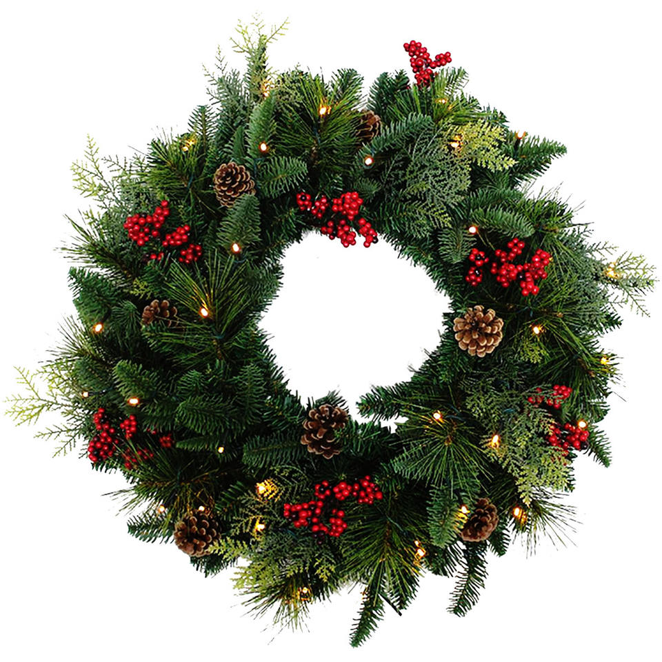 Product name:24" Pre-Lit Christmas Wreath with Pine Cones & Red Berries