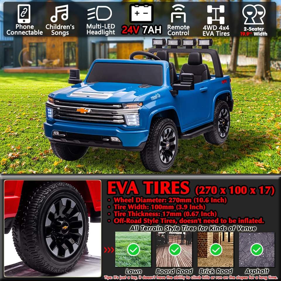 Auto de Juguete de 24V para 2 Personas con Control Remoto, Camioneta Silverado Licenciada para Niños y Niñas - Reproduce Música (Azul)