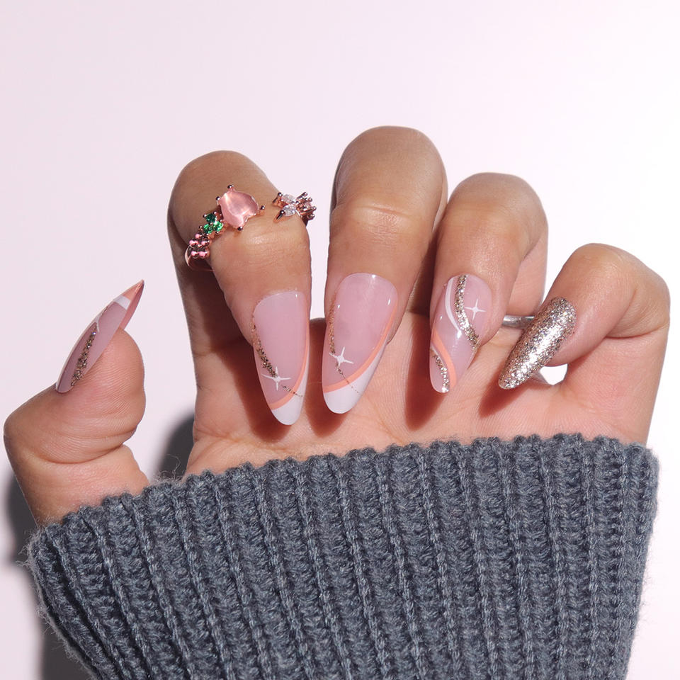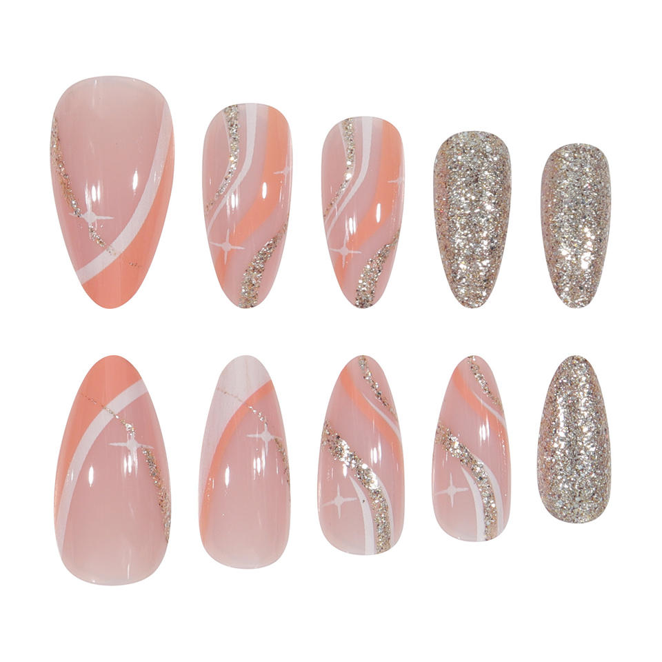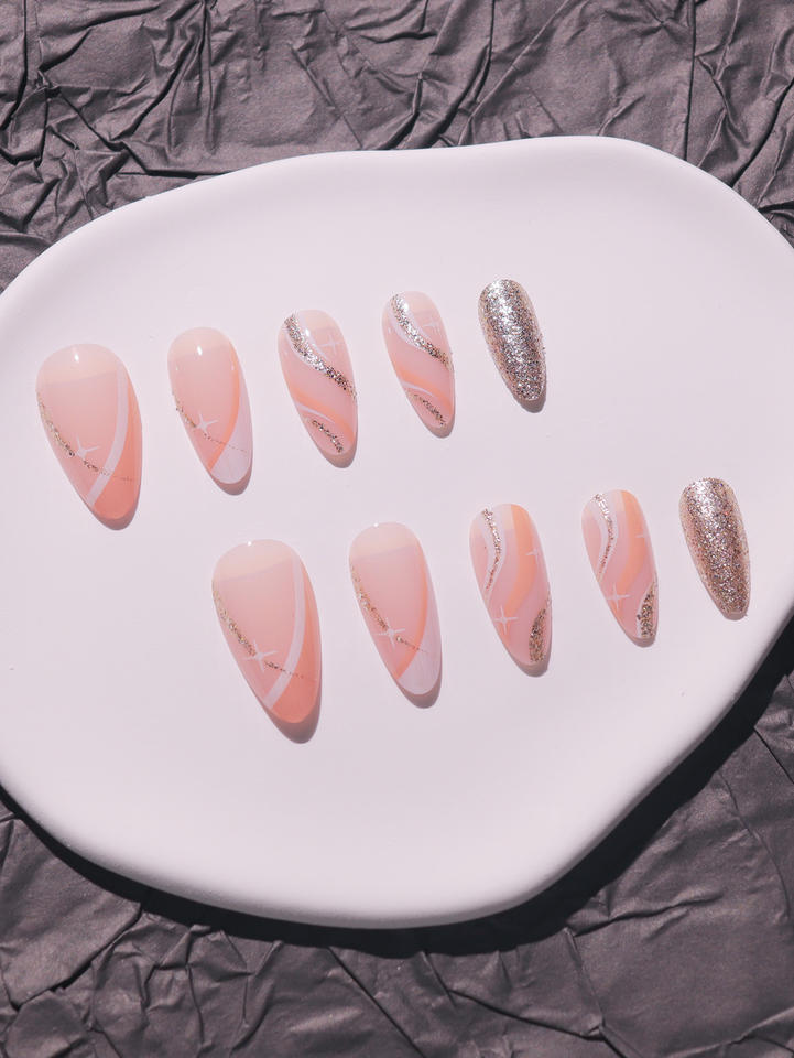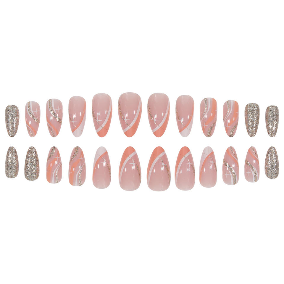 24 Uds patrón de ataúd de almendra puntas de uñas postizas francesas Material ABS suave y cómodo manicura a presión en plata y brillo dorado