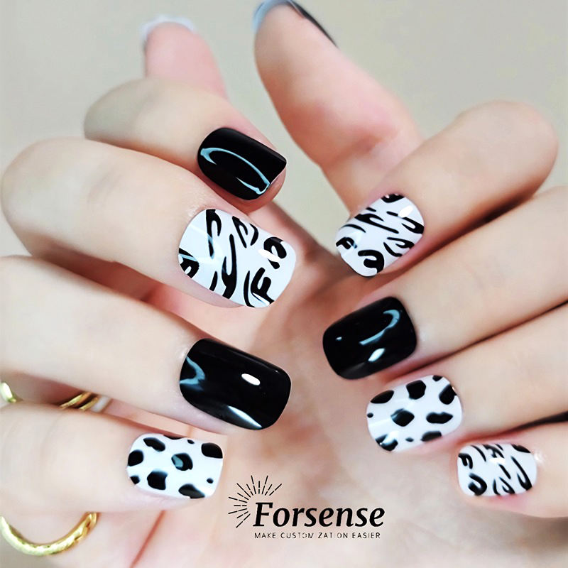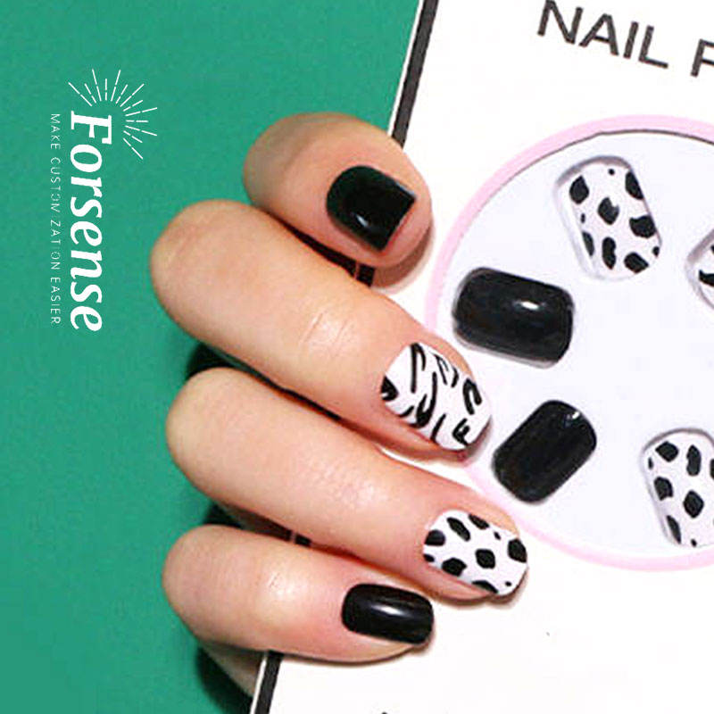 24 piezas de embalaje personalizado, prensa cuadrada corta en las uñas, diseños de impresión de vaca en blanco y negro, Uñas postizas, suministros profesionales para uñas postizas ABS