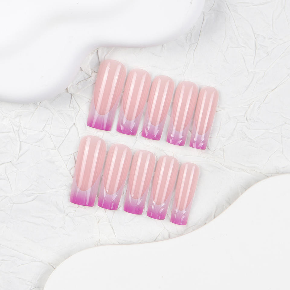 24 Uñas Postizas Francesas en Degradado Rosa y Morado, Diseño Simple y Moderno, Relieve 3D, Patrón de Tubería de Agua, Uñas de Presión ABS
