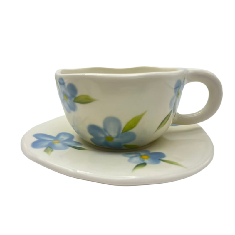 Taza de Cerámica de 250 ml Estilo Ins, Hecha a Mano, con Forma Irregular de Flor, para Té con Leche, Café, con Plato, Diseño de Flor de Cereza y Fresa