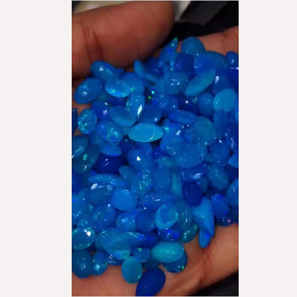 Palabra clave:Corte facetado ovalado tipo pera de ópalo azul, gemas de tamaños mixtos.