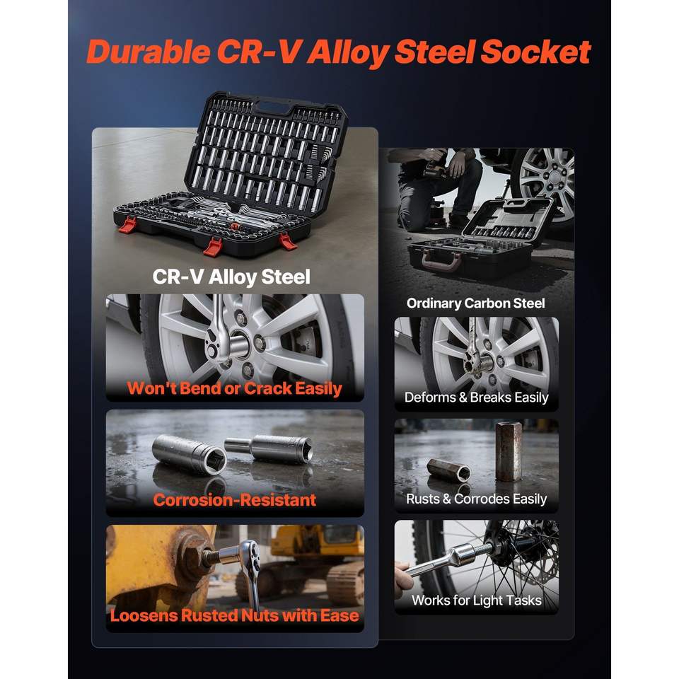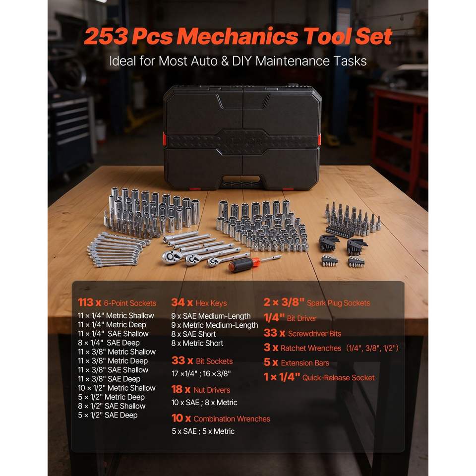 Juego de Herramientas de Reparación de Automóviles de 253 Piezas, Kit de Mecánica con Llaves de Tubo de 1/4'', 3/8'' y 1/2'' SAE y Métricas, Destornilladores para Mantenimiento de Vehículos