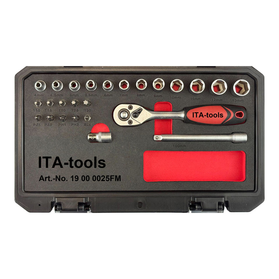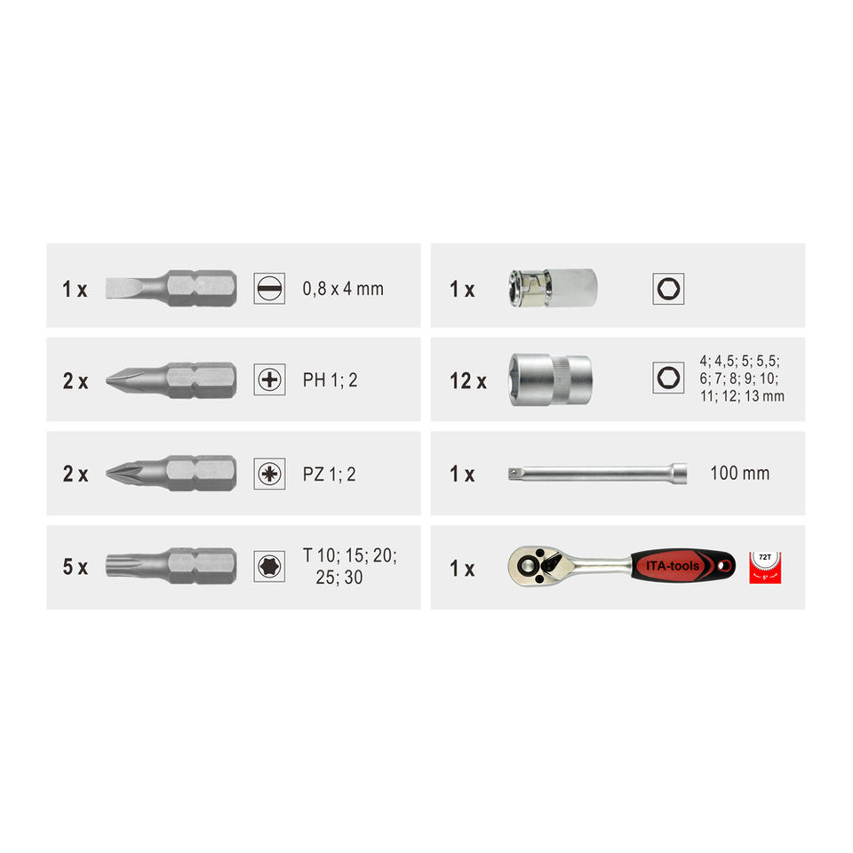 Bit, Barra de extensión, Manija del trinquete, Zócalo, Adaptador de bitsHerramienta incluye