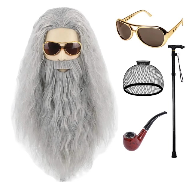 26 pulgadas largo rizado mullido mago y montaña cueva salvaje Cosplay juego de rol barba peluca tocado + bastón + Tubo + gafas + red para el cabello