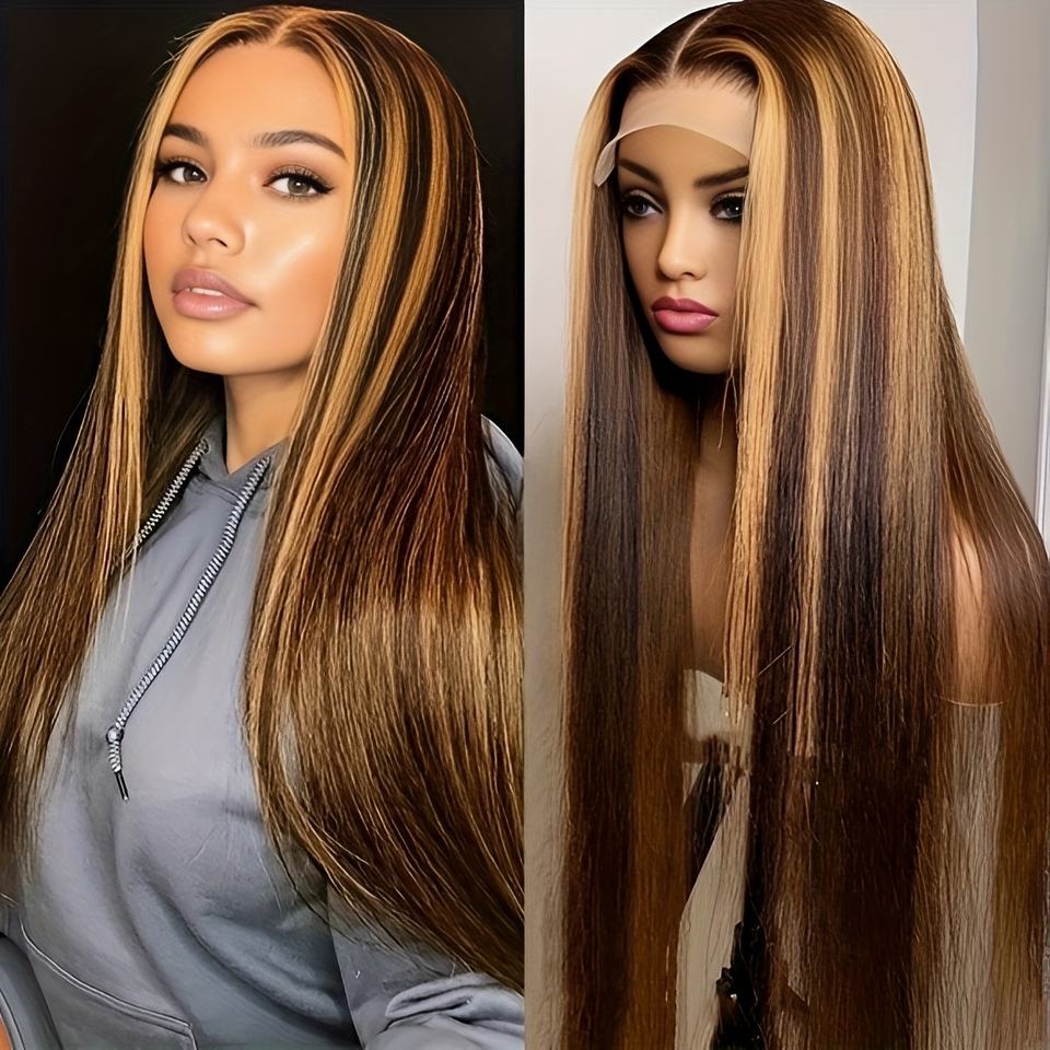 Peluca de Cabello Sintético con Frente de Encaje Recto de 26 Pulgadas, Peluca Larga Ondulada con Parte Media para Mujer, Aspecto Natural, Fibra Resistente al Calor