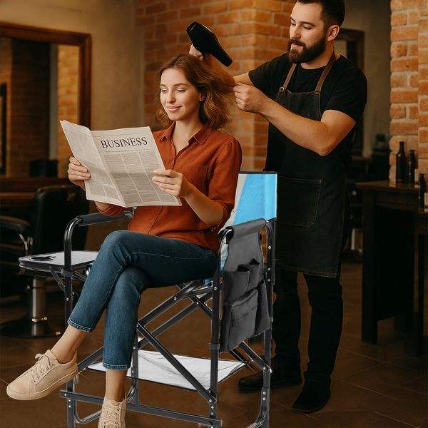 Silla de Director Plegable de 26 Pulgadas de Alto con Reposapiés, Silla de Camping Portátil con Portavasos y Mesa Lateral de Almacenamiento