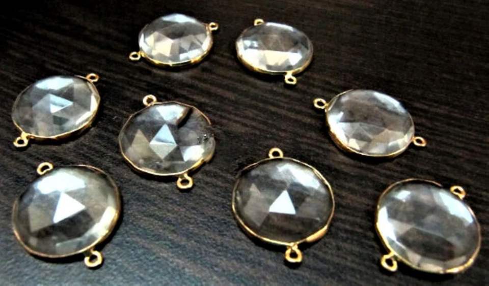 Juego de 2 uds., forma de moneda de cristal de roca Natural, conector Briolette de 18mm, Conector de bisel de cuarzo de cristal genuino