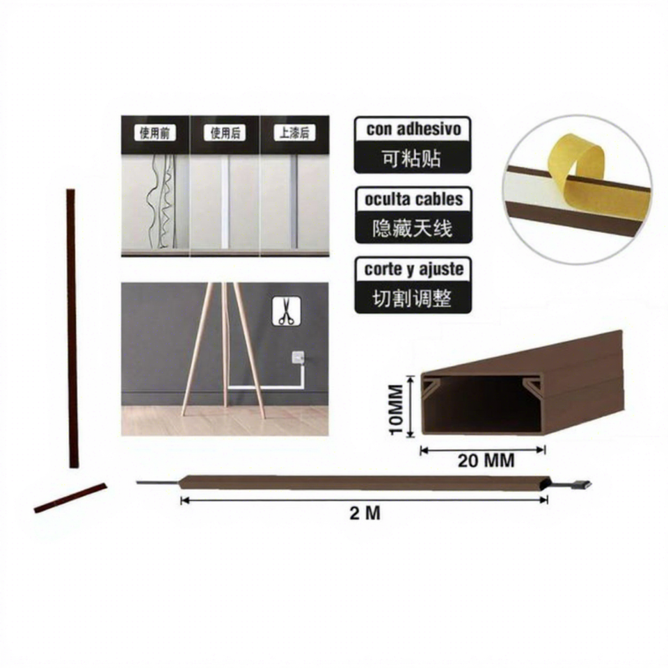 Canaletas de PVC Adhesivas Marrones de 2m, 20x10x9mm, para Cableado y Gestión de Cables