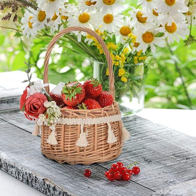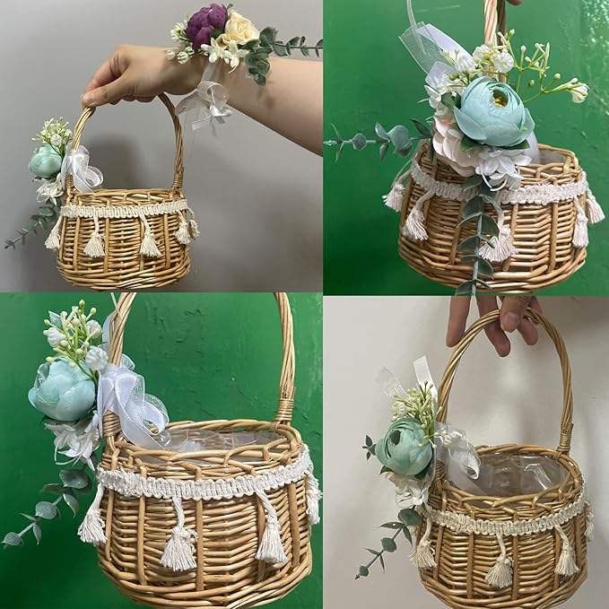 2 cestas de flores de mimbre de macramé amarillo para decoración de boda o jardín con flores de seda