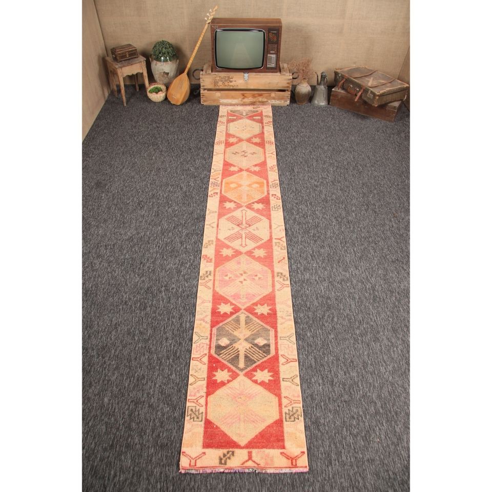 Alfombra Turca de 2x11.8 pies, Alfombra Vintage Roja con Diseño Geométrico