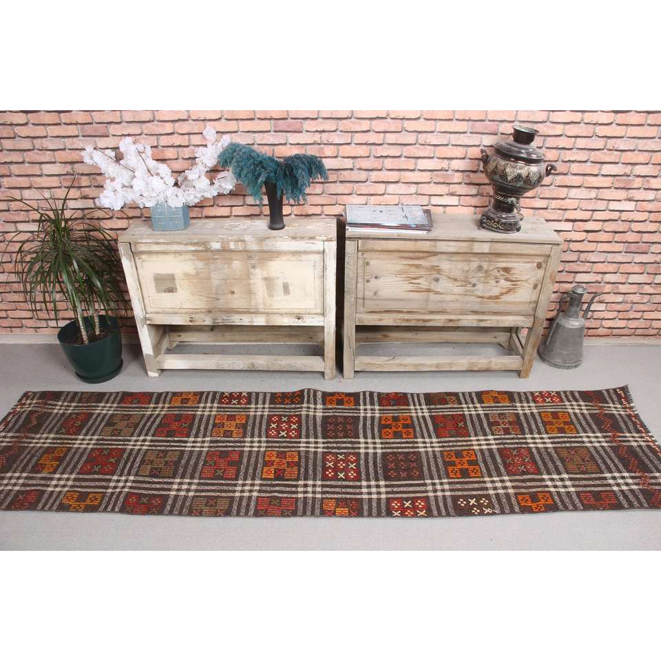 Alfombra Turca de 2x8.1 pies, Alfombra Kilim, Alfombra Floral Marrón de Lana