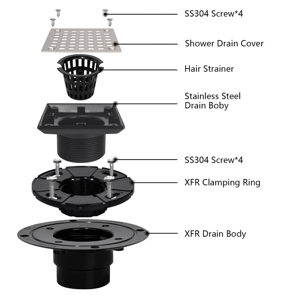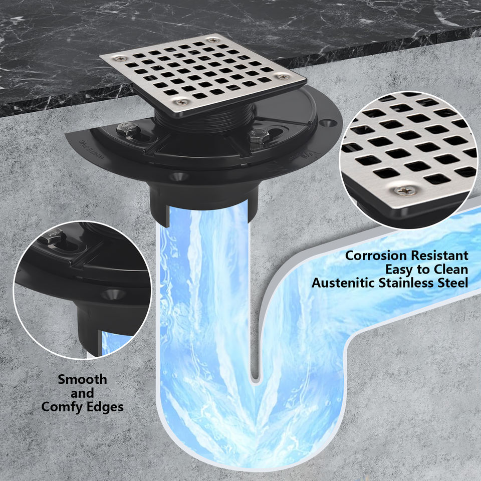 Drenaje de Ducha Cuadrado Cepillado de 3-1/2 Pulgadas con Filtro de Pelo, Cubierta de Acero Inoxidable, Base de ABS, Certificación CUPC para Baño
