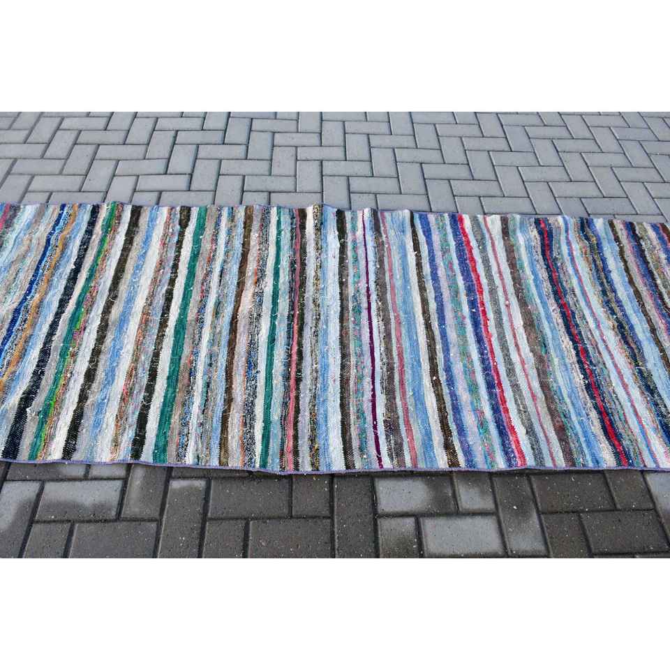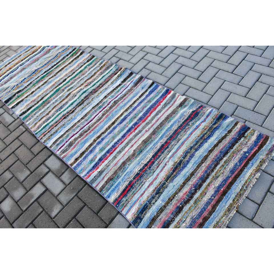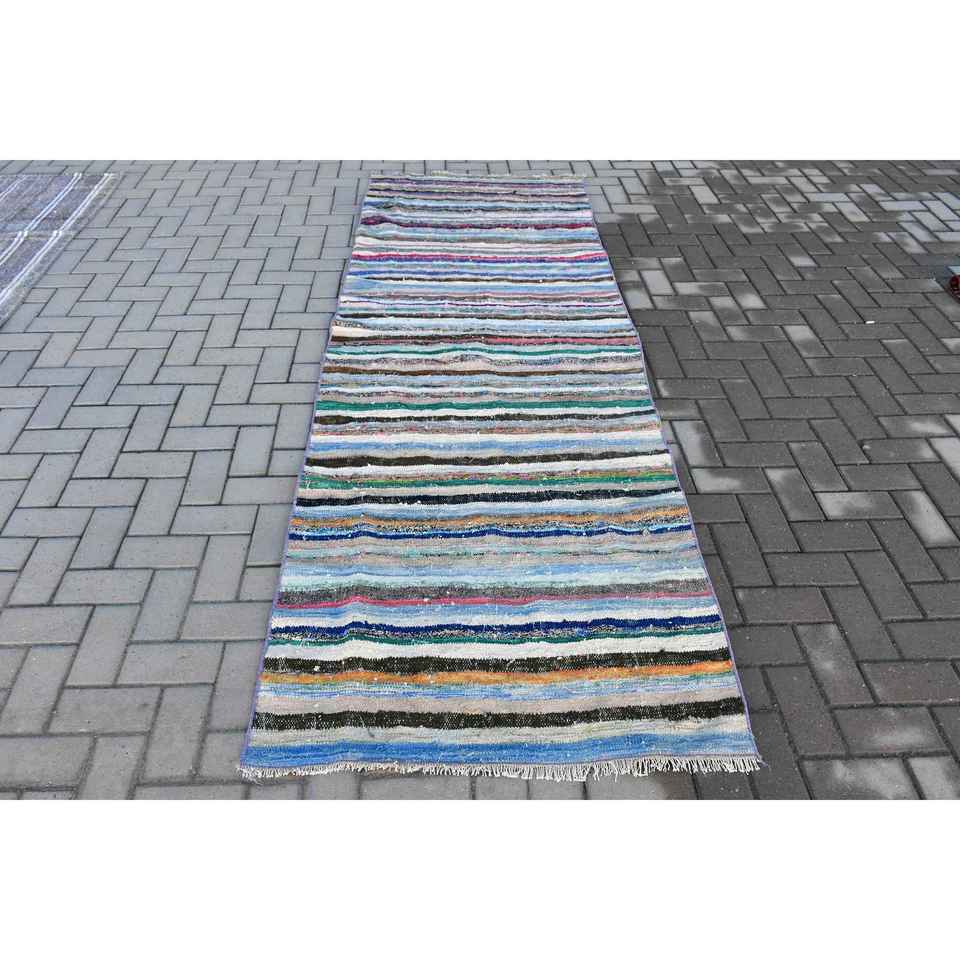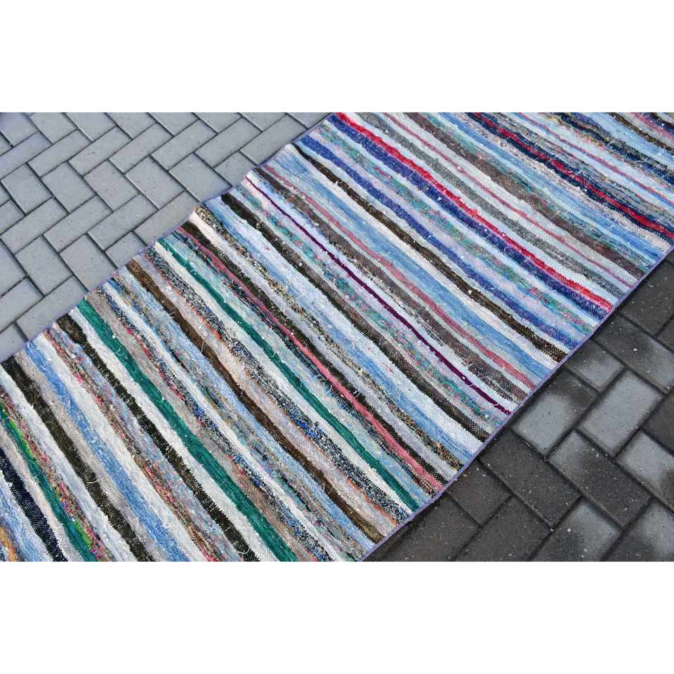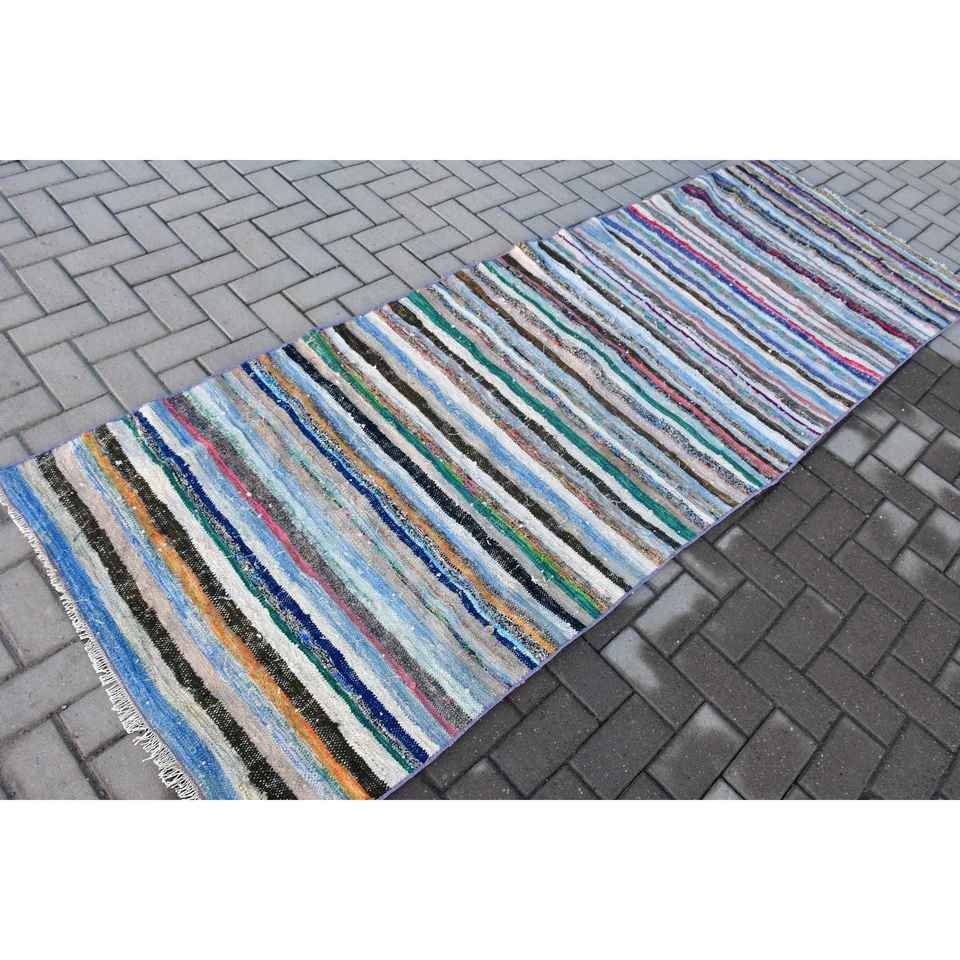 Alfombra de 3.2x9.4 pies, Alfombra Turca Vintage, Alfombra de Lana a Rayas Azul Verde
