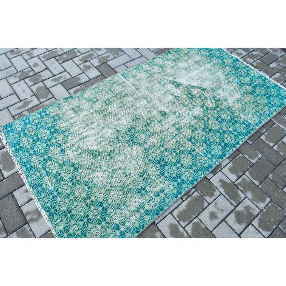 Alfombra Turca de 3.37x6.1 pies, Alfombra Vintage de Lana con Diseño a Cuadros Azules