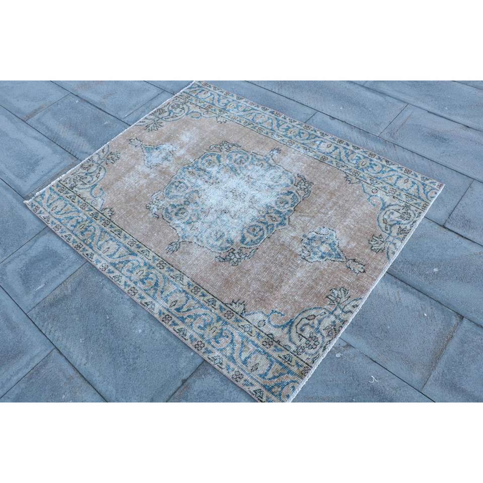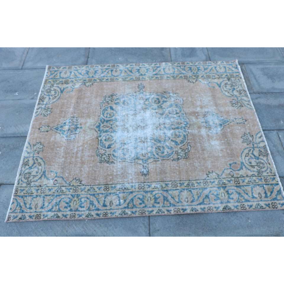 Alfombra Turca de 3.6x4.4 pies, Alfombra Vintage, Alfombra de Lana Azul Sólida