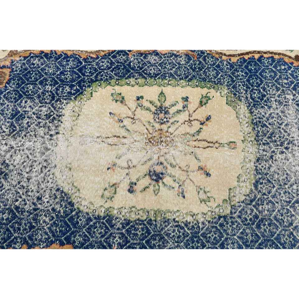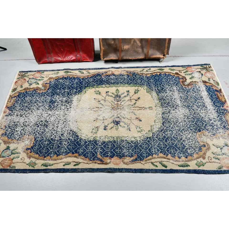 Alfombra de 3.6x6.8 pies, Alfombra Turca Vintage, Alfombra Oriental de Lana Azul y Blanca
