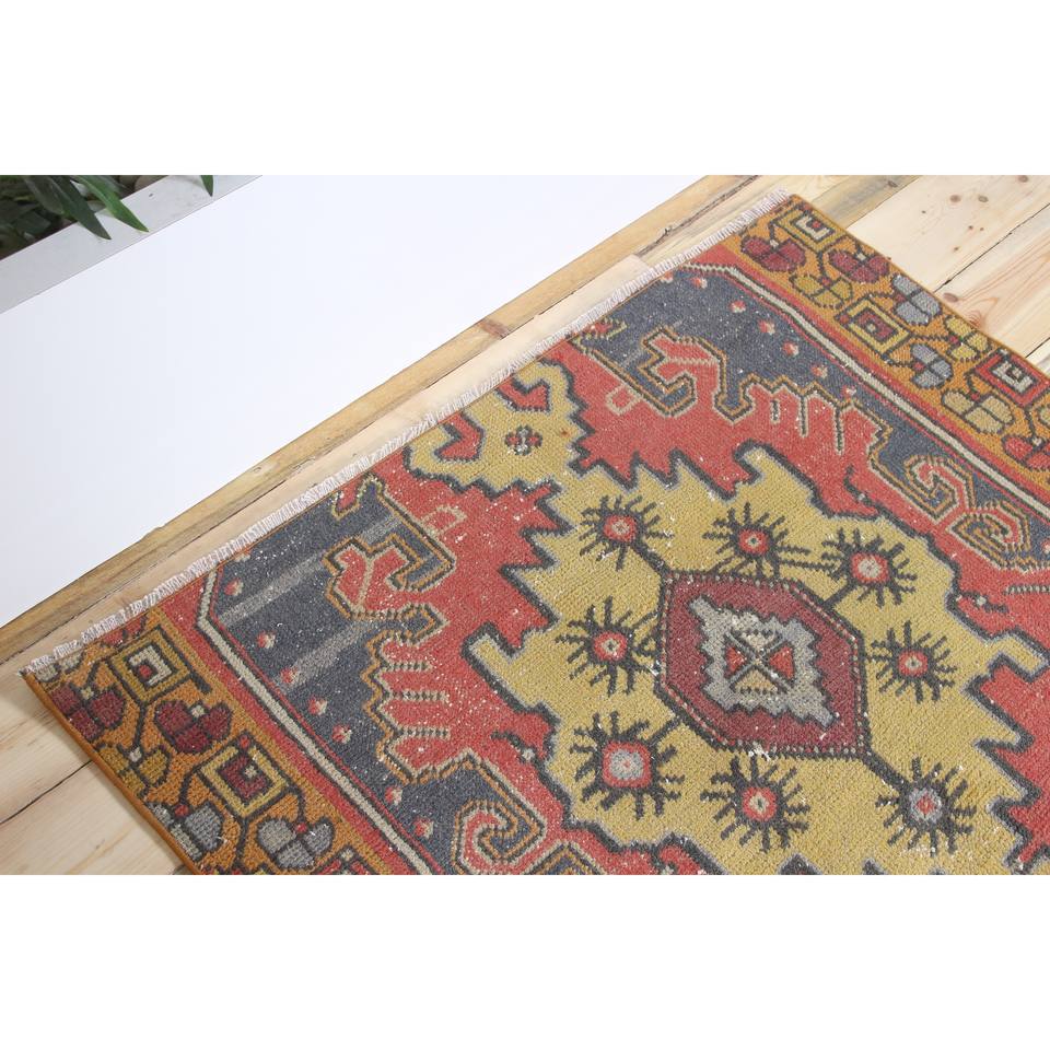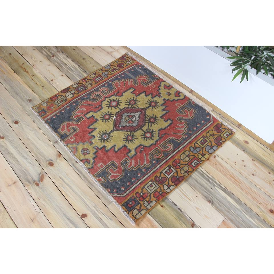 Alfombra Turca de 3.7x3 pies, Alfombra Pequeña Vintage, Alfombra Geométrica Roja y Amarilla