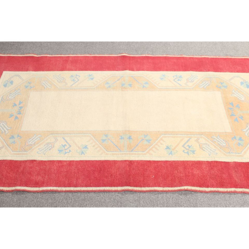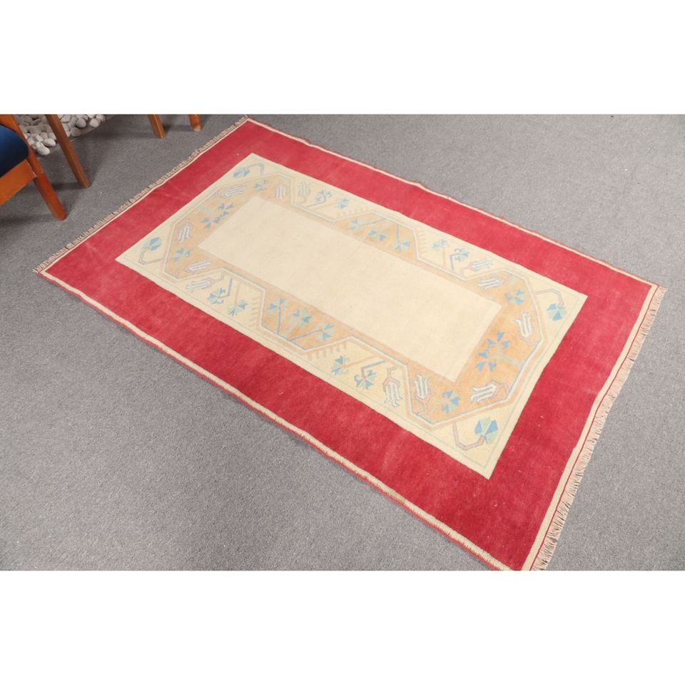 Alfombra vintage de 3.7x5.9 pies, alfombra turca pequeña, geométrica roja y beige con elementos florales.
