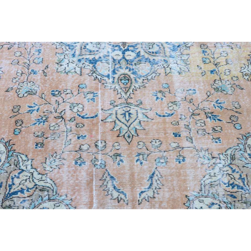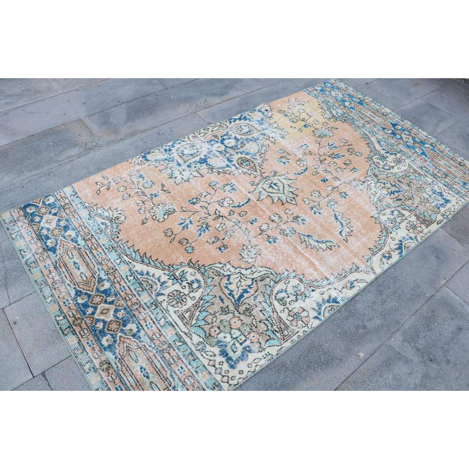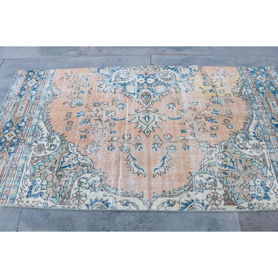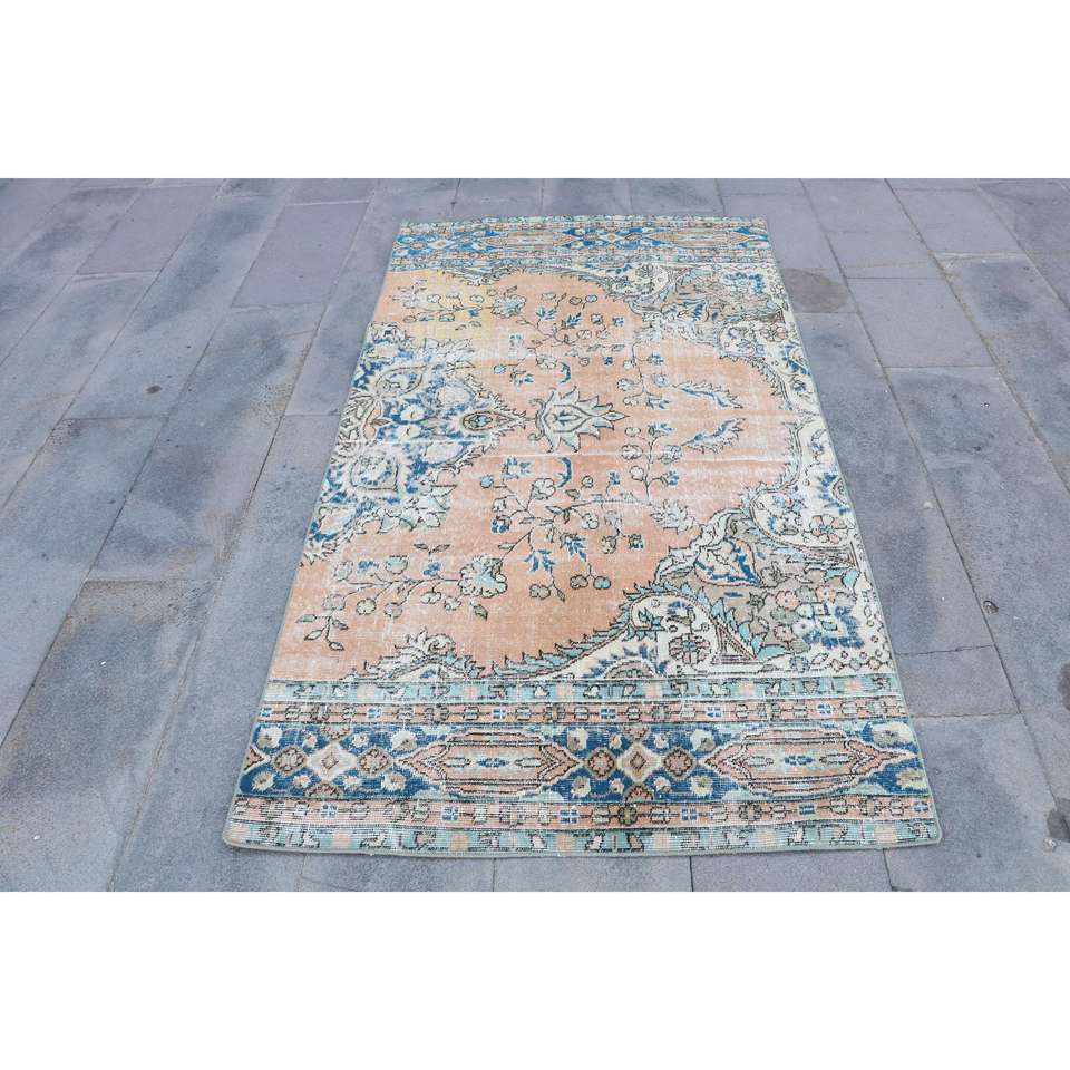Alfombra Turca de 3.8x6.9 pies, Alfombra de Lana Vintage con Diseño Floral Azul