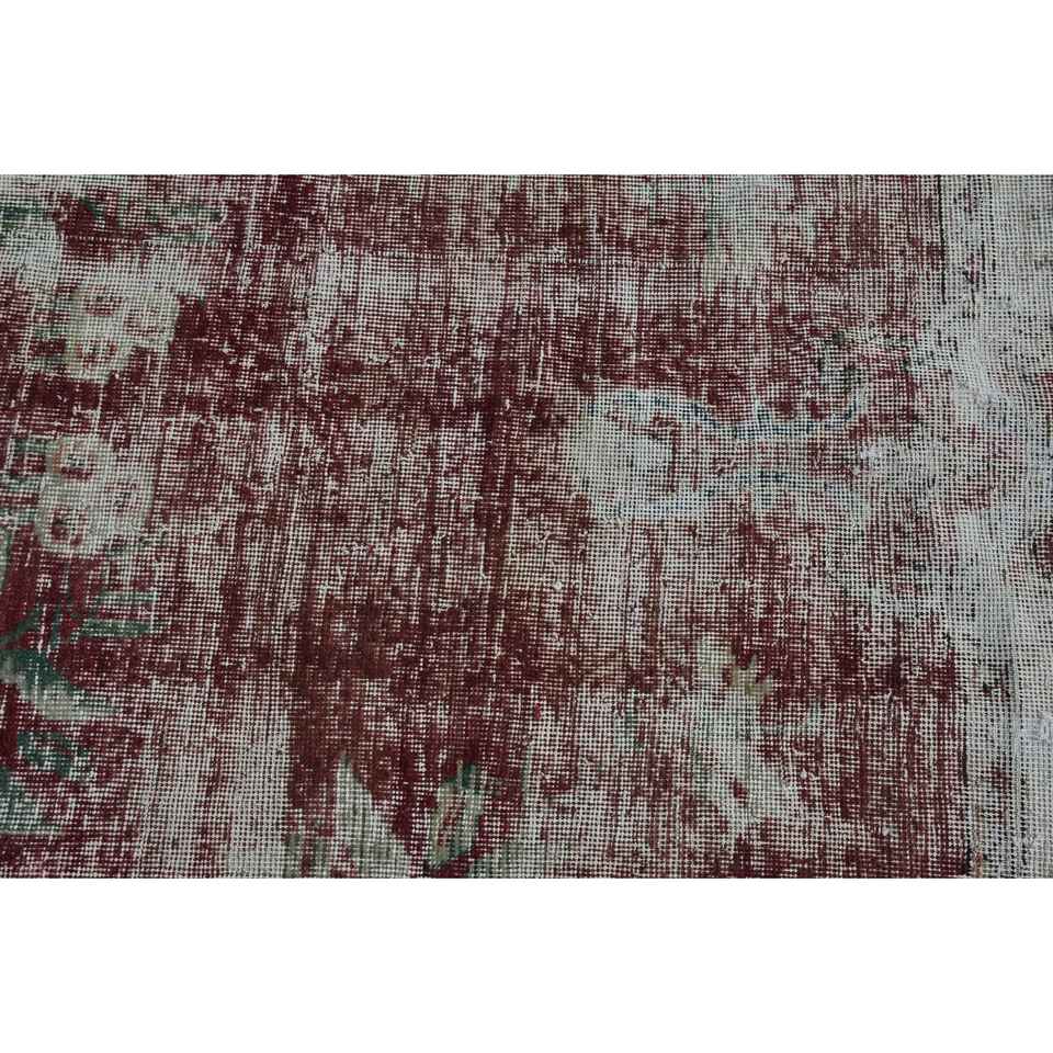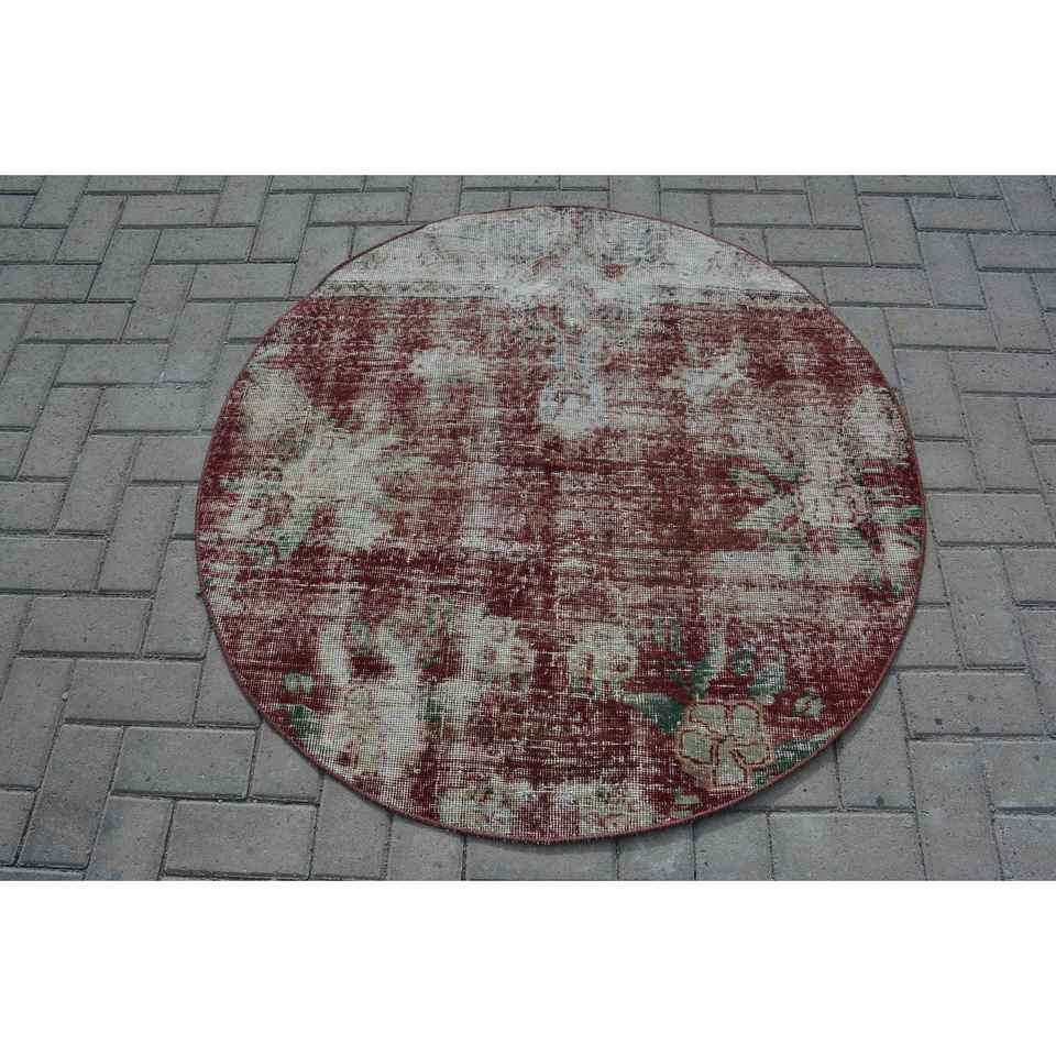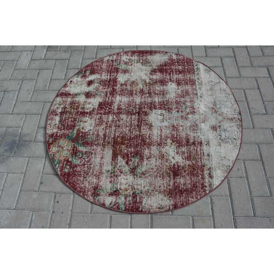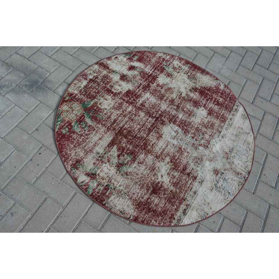 Alfombra Redonda Vintage de 3.9x4 pies, Alfombra Oriental Turca Roja y Verde de Lana con Diseño de Patchwork, Respaldo de Látex Ecológico