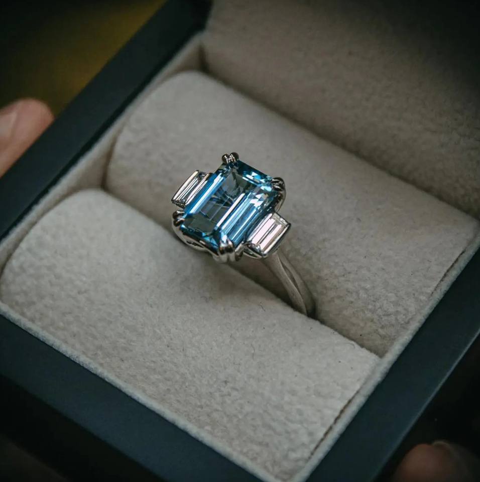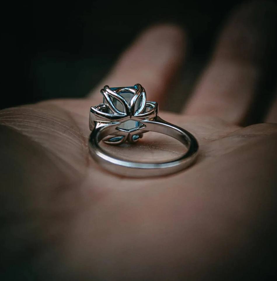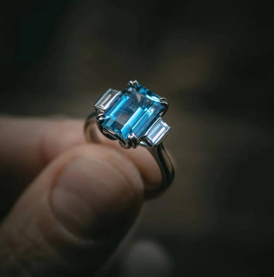 Nombre del producto:Corte esmeralda de lujo azul color laboratorio diamante tres piedra anillo de diamantes