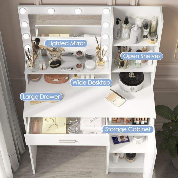 Espejo de Maquillaje con Luz y 3 Modos de Iluminación, Brillo Ajustable, Cajón Grande, Tres Niveles de Almacenamiento, Tocador